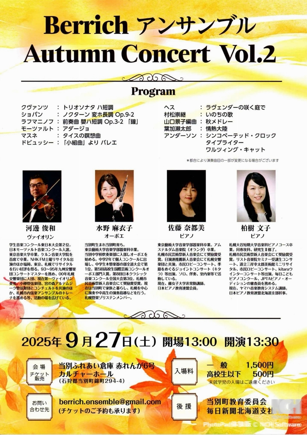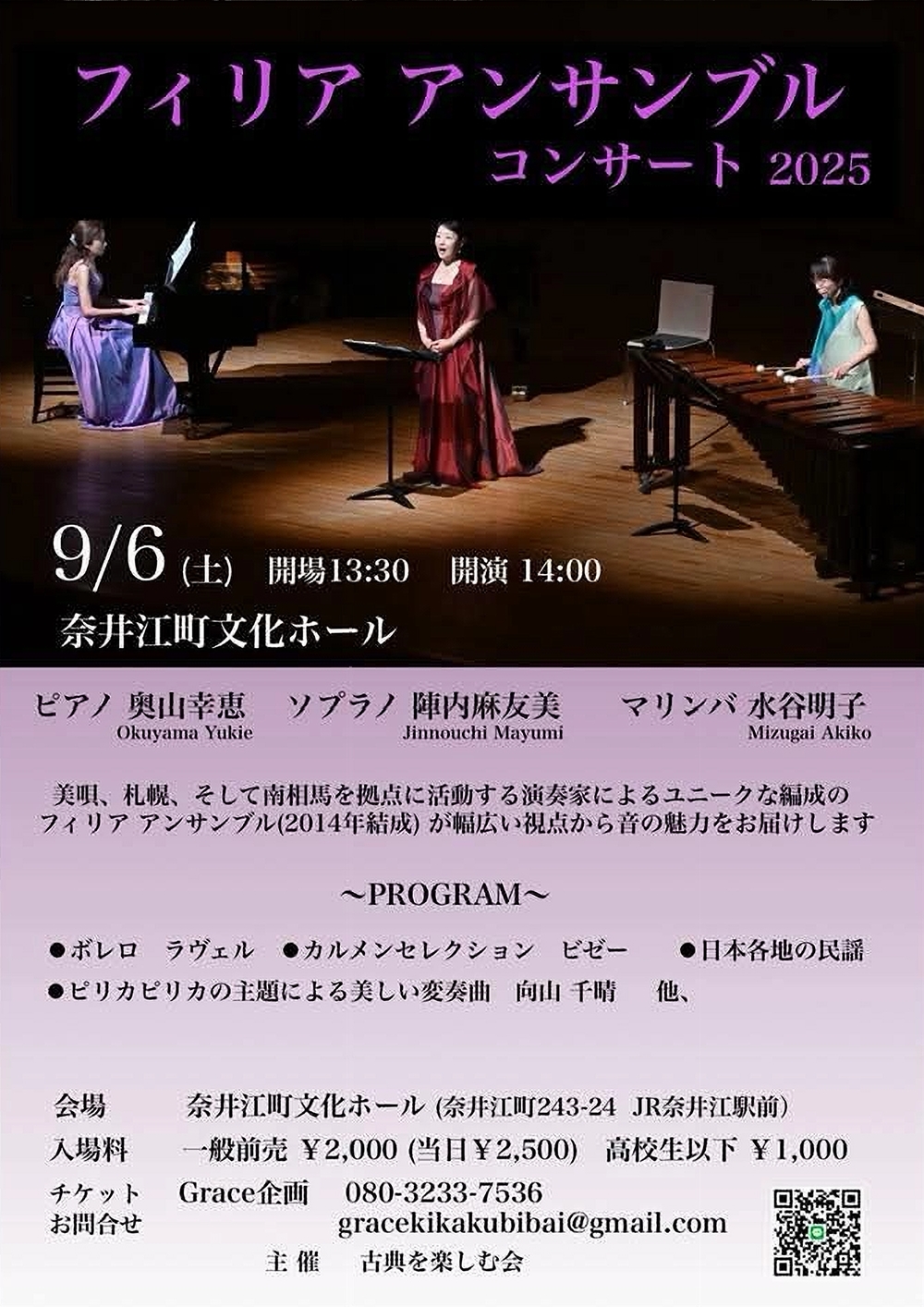 フィリア アンサンブルコンサート2025 9月6日(土)14:00 奈井江町文化ホール(空知郡奈井江町243-24) 出演 ピアノ/奥山 幸恵 ソプラノ/陣内麻友美 マリンバ/水谷 明子 曲目 ラヴェル/ボレロ ビゼー/カルメンセレクション 日本各地の民謡 向山千晴/ピリカピリカの主題による美しい変奏曲 ・・・他 |