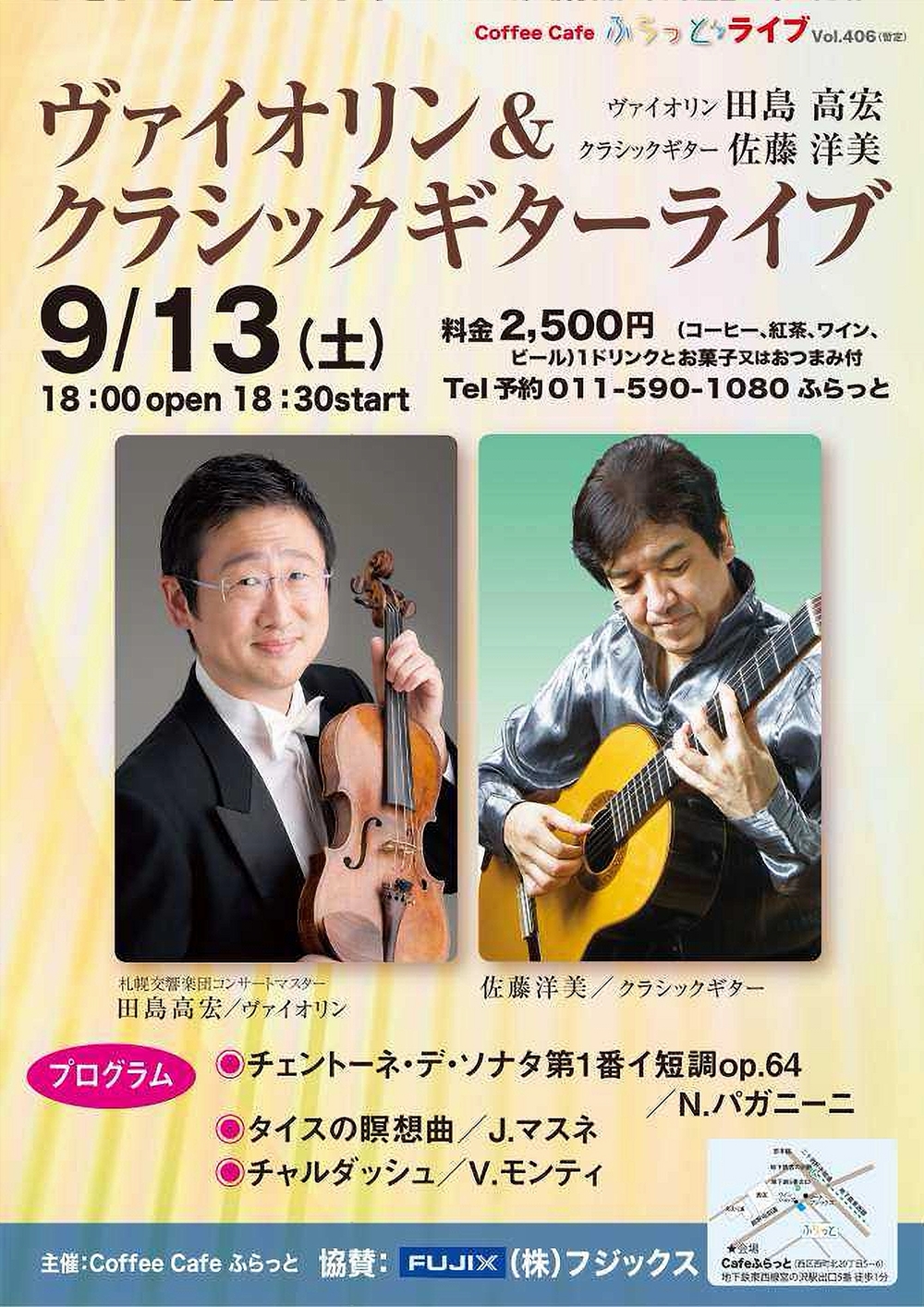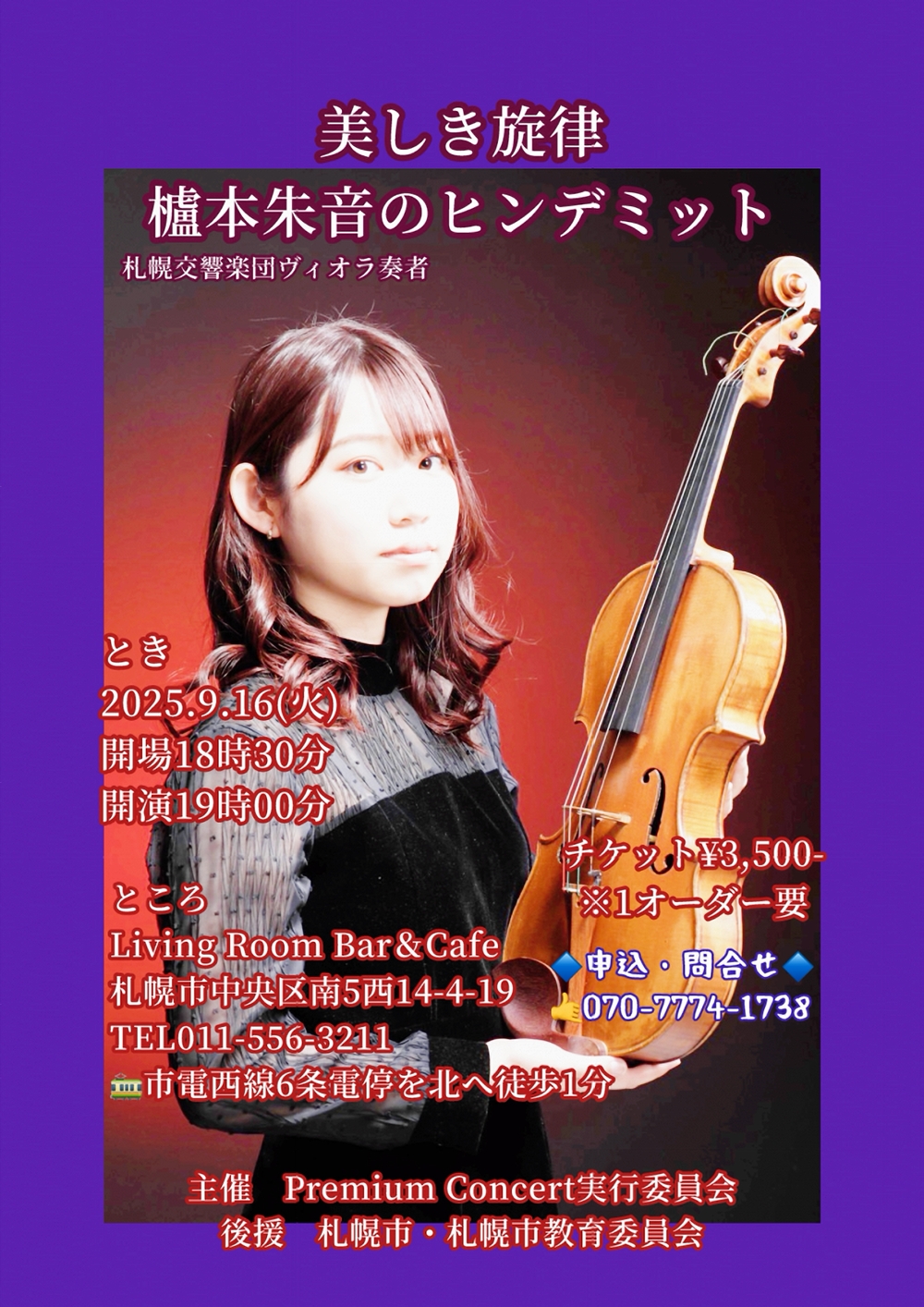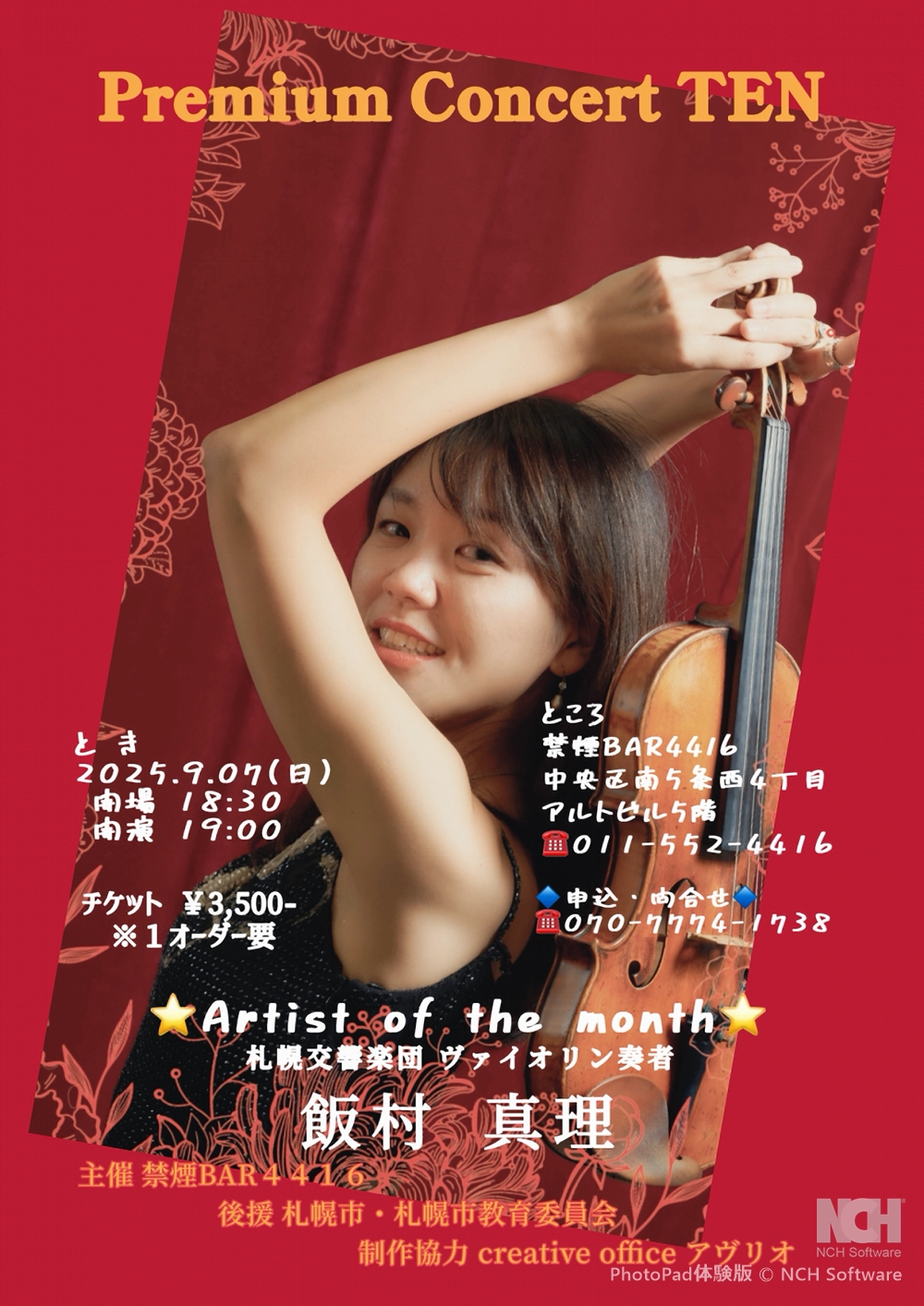 Premium Concert TEN~極上の音楽を特別な空間で~ Premium Concert TENは 、 札幌交響楽団メンバーのソロ出演によるミニコンサート 9月7日(日)19:00 禁煙BAR4416(札幌市中央区南5条西4丁目アルトビル5階) 出演 ヴァイオリン/飯村 真理(札響ヴァイオリン奏者) 曲目 バロックバイオリンにより古の調べを奏でるクラシック名曲選。演奏を聴く機会の大変少ないバロックバイオリンの繊細で美しい音色をお楽しみ頂だきます。。 |
