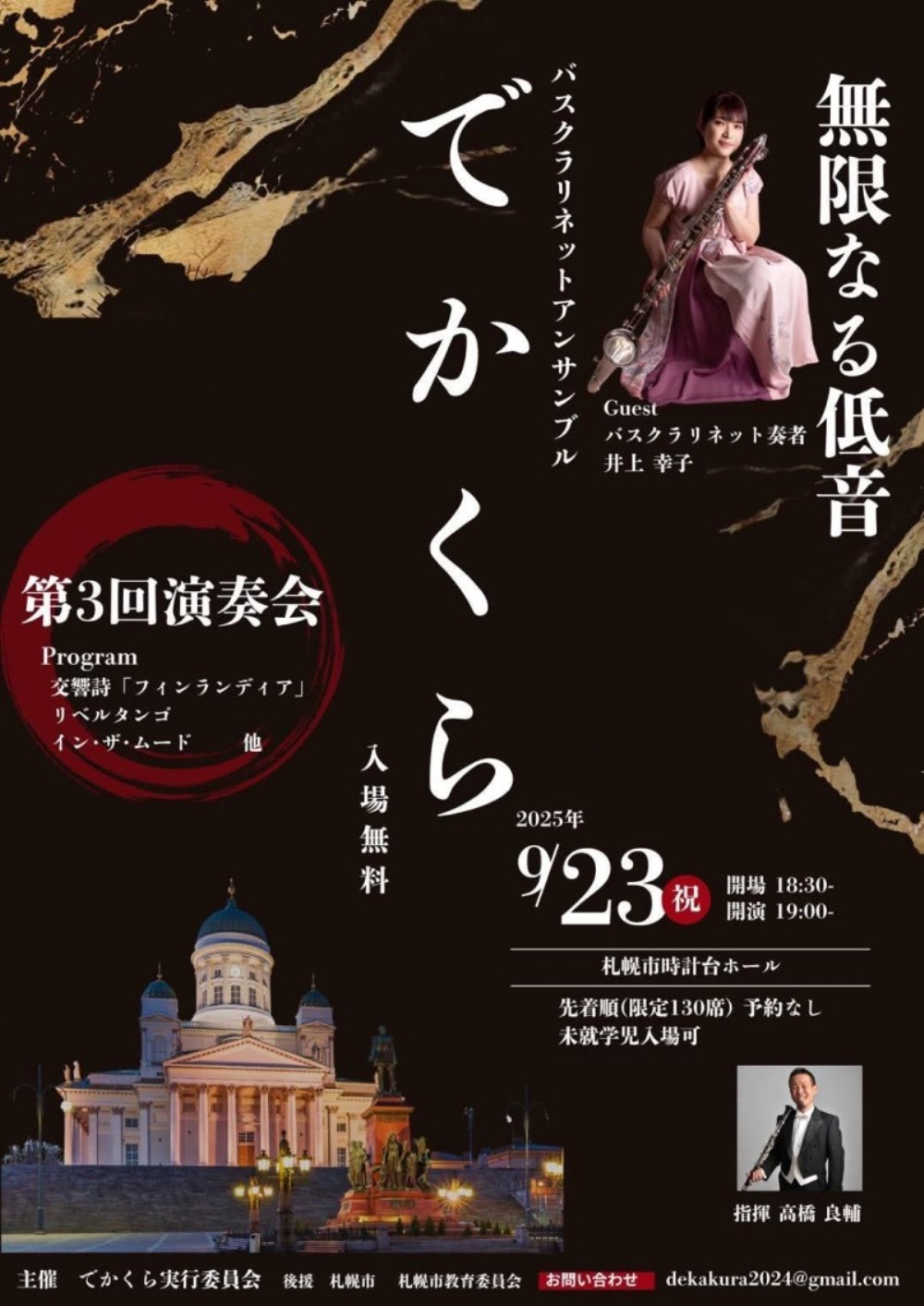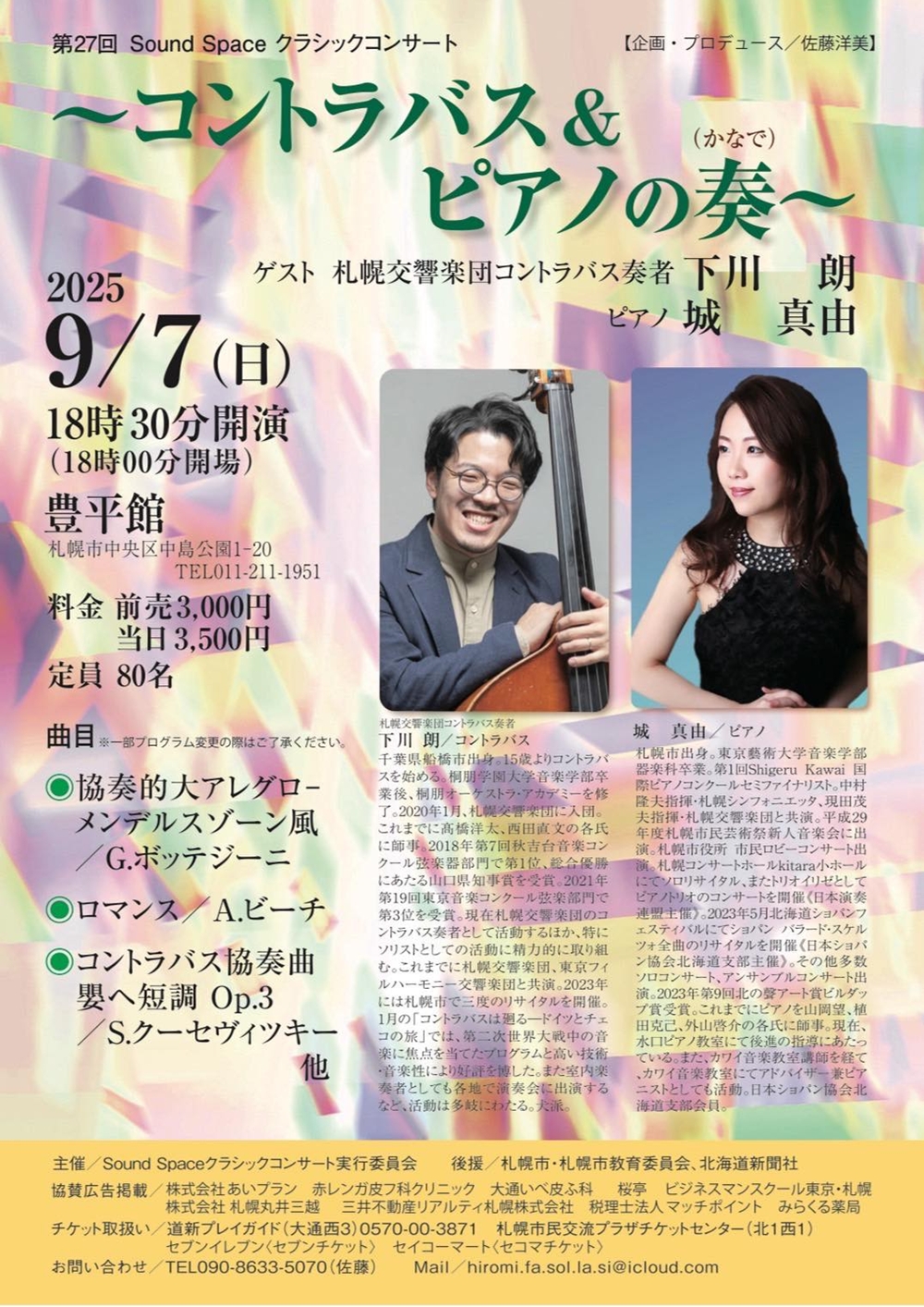 コントラバス&ピアノの奏9月7日(日)18:30 国指定重要文化財「豊平館」(札幌市中央区中島公園1-20) 出演 コントラバス/下川 朗(ゲスト。札響コントラバス奏者) ピアノ/城 真由(カワイ音楽教室アドバイザー兼ピアニスト) 曲目 G.ボッテジーニ/競争的アレグロ-メンデルスゾーン風 A.ビーチ/ロマンス S.クーゼヴィツキー/コントラバス協奏曲嬰ヘ短調Op.3 ・・・他 |