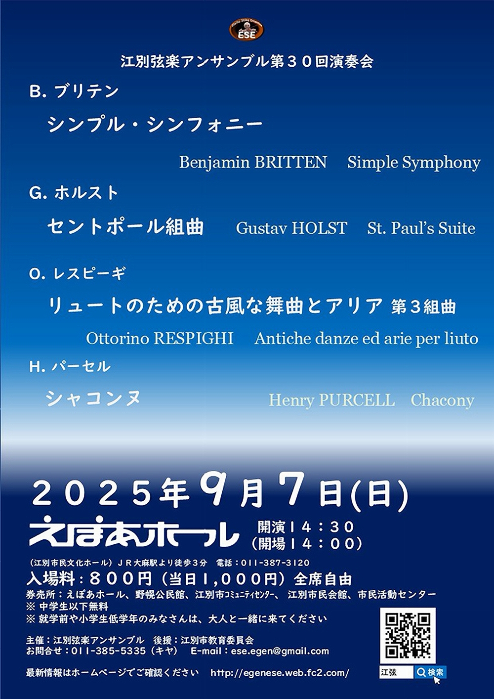 江別弦楽アンサンブル第30回演奏会 9月7日(日)14:30 えぽあホール(江別市民文化ホール。江別市大麻中町26-7) 出演 弦楽演奏/江別弦楽アンサンブル 曲目 B.ブリテン/シンプル・シンフォニー G.ホルスト/セントポール組曲 O.レスピーギ/リュートのための古風な舞曲とアリア第3組曲 H.パ-セル/シャコンヌ |