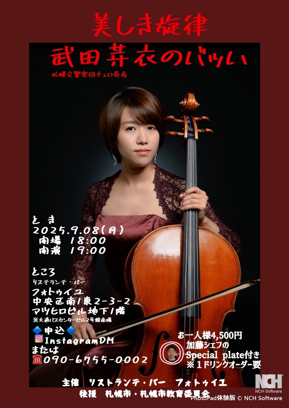 美しき旋律武田芽衣のバッハ ~極上の音楽を特別な空間で~ 札響の愛称で親しまれている北海道唯一の プロオーケストラ札幌交響楽団のメンバーがソロ出演で 名曲クラシックに挑む「美しき旋律」シリーズ 9月8日(月)19:00~20:00 リストランテ・バー フォトゥイユ(札幌市中央区南1条東2丁目3-2マツヒロビル地下1階) 出演 チェロ/武田 芽衣(札響チェロ奏者) 曲目 チェロ奏者武田芽衣さんが、J.S.バッハ「無伴奏チェロ組曲」に挑みます。 |