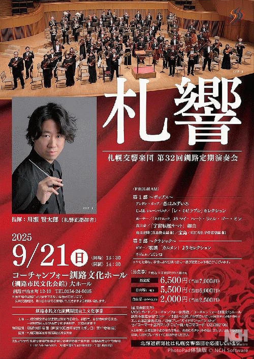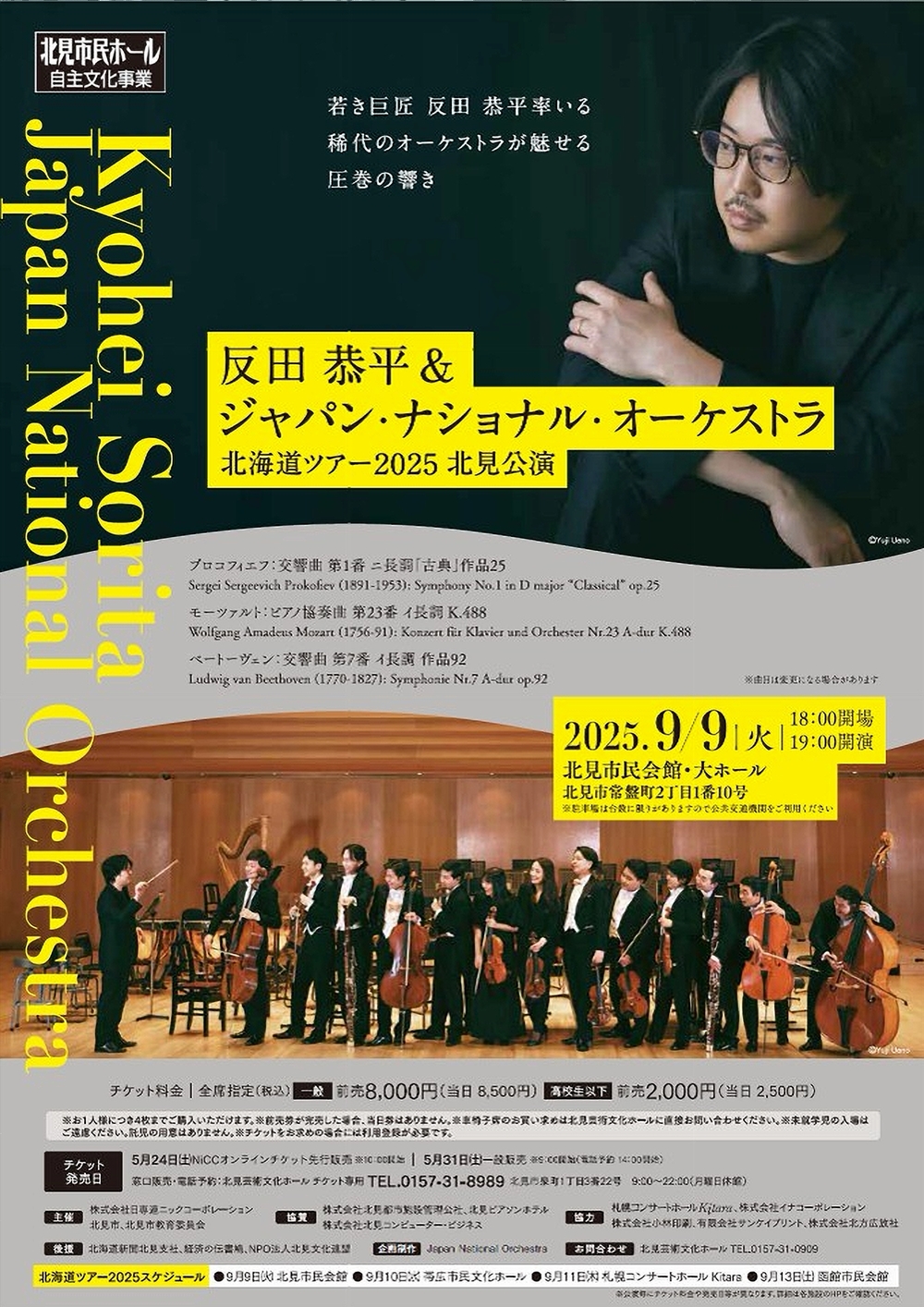 反田恭平(指揮・ピアノ)& ジャパン・ナショナル・オーケストラ 北見公演 9月9日 (水) 19:00 北ガス市民ホール(旧北見市民会館。北見市常盤町2) 出演 指揮者/反田 恭平 管弦楽/ジャパン・ナショナル・オーケストラ ヴァイオリン: 岡本 誠司 、大江 馨、 東 亮汰、桐原 宗生(札響首席奏者)、島方 瞭、宇野由樹子、石原 悠企 ビオラ/有田 朋央、長田 健志、辻 菜々子 チェロ/森田 啓介、水野 優也、香月 麗、佐々木賢二 コントラバス/大槻 健 フルート/八木 瑛子 オーボエ/荒木 奏美、浅原 由香(札響副首席奏者) ホルン/庄司 雄大、鈴木 優 ファゴット/皆神 陽太、古谷 拳一 クラリネット/アレッサンドロ・ベヴェラリ ヴァイオリン/中村友希乃 コントラバス/水野 斗希 フルート/河野 葉月 曲目 セルゲイ・プロコフィエフ/交響曲第1番ニ長調『古典』作品25 ヴォルフガング・アマデウス・モーツァルト/ピアノ協奏曲第23番イ長調K.488 ルートヴィヒ・ヴァン・ベートーヴェン/交響曲第7番イ長調作品92 |