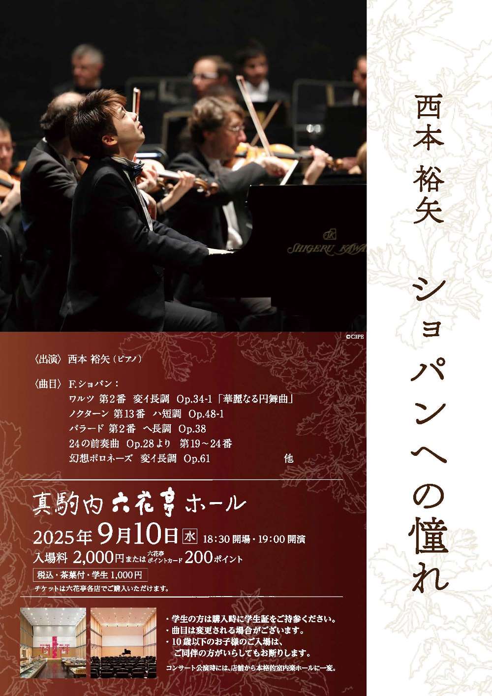 西本裕矢ショパンへに憧れ 9月10日(水)19:00 真駒内六花亭ホール店(札幌市南区真駒内上町1丁目15-16-2) 出演 ピアノ/西本 裕矢 曲目 F.ショパン/ ワルツ第2番変イ長調Op.34-1「華麗なる円舞曲」 ノクターン第13番ハ短調Op.48-1 バラード第2番ヘ長調Op.38 24の前奏曲Op.28より第19~24番 幻想ポロネーズ変イ長調Op.61 ・・・他 |