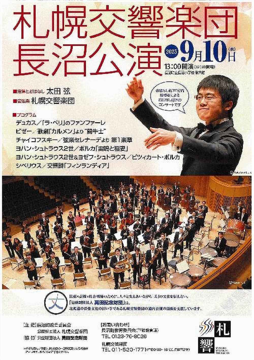 札幌交響楽団長沼公演 9月10日(水)13:00 長沼町立長沼小学校体育館(夕張郡長沼町銀座北1丁目3-1) 出演 指揮/太田 弦 管弦楽/札幌交響楽団 曲目 デュカス/「ラ・べり」のファンファーレ ビゼー/歌劇『カルメン』より「闘牛士」 チャイコフスキー/『弦楽セレナーデ』より「第1楽章」 ヨハンシュトラウス2世/ポルカ「雷鳴と稲妻」 ヨハンシュトラウス2世&ヨゼフ・シュトラウス/ビツィカート・ポルカ シベリウス/交響詩「フィンランディア」 |