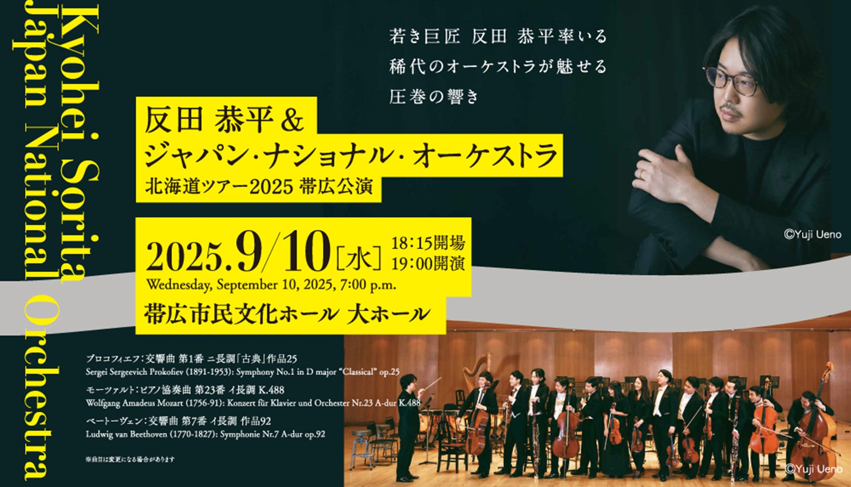 反田恭平(指揮・ピアノ)& ジャパン・ナショナル・オーケストラ 帯広公演 9月10日 (水) 19:00 帯広市民文化ホール大ホール(帯広市西5条南11丁目48-2) 出演 指揮者/反田 恭平 管弦楽/ジャパン・ナショナル・オーケストラ ヴァイオリン: 岡本 誠司 、大江 馨、 東 亮汰、桐原 宗生(札響首席奏者)、島方 瞭、宇野由樹子、石原 悠企 ビオラ/有田 朋央、長田 健志、辻 菜々子 チェロ/森田 啓介、水野 優也、香月 麗、佐々木賢二 コントラバス/大槻 健 フルート/八木 瑛子 オーボエ/荒木 奏美、浅原 由香(札響副首席奏者) ホルン/庄司 雄大、鈴木 優 ファゴット/皆神 陽太、古谷 拳一 クラリネット/アレッサンドロ・ベヴェラリ ヴァイオリン/中村友希乃 コントラバス/水野 斗希 フルート/河野 葉月 曲目 セルゲイ・プロコフィエフ/交響曲第1番ニ長調『古典』作品25 ヴォルフガング・アマデウス・モーツァルト/ピアノ協奏曲第23番イ長調K.488 ルートヴィヒ・ヴァン・ベートーヴェン/交響曲第7番イ長調作品92 |