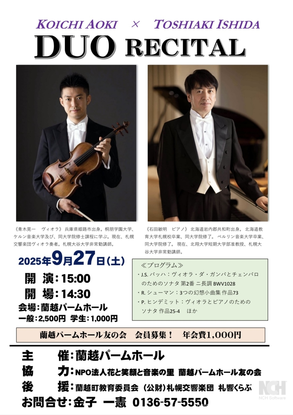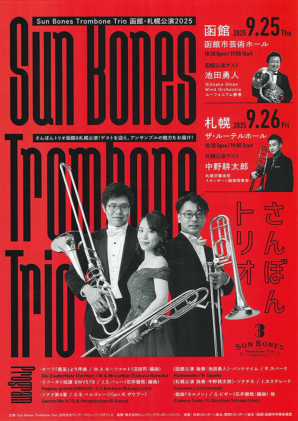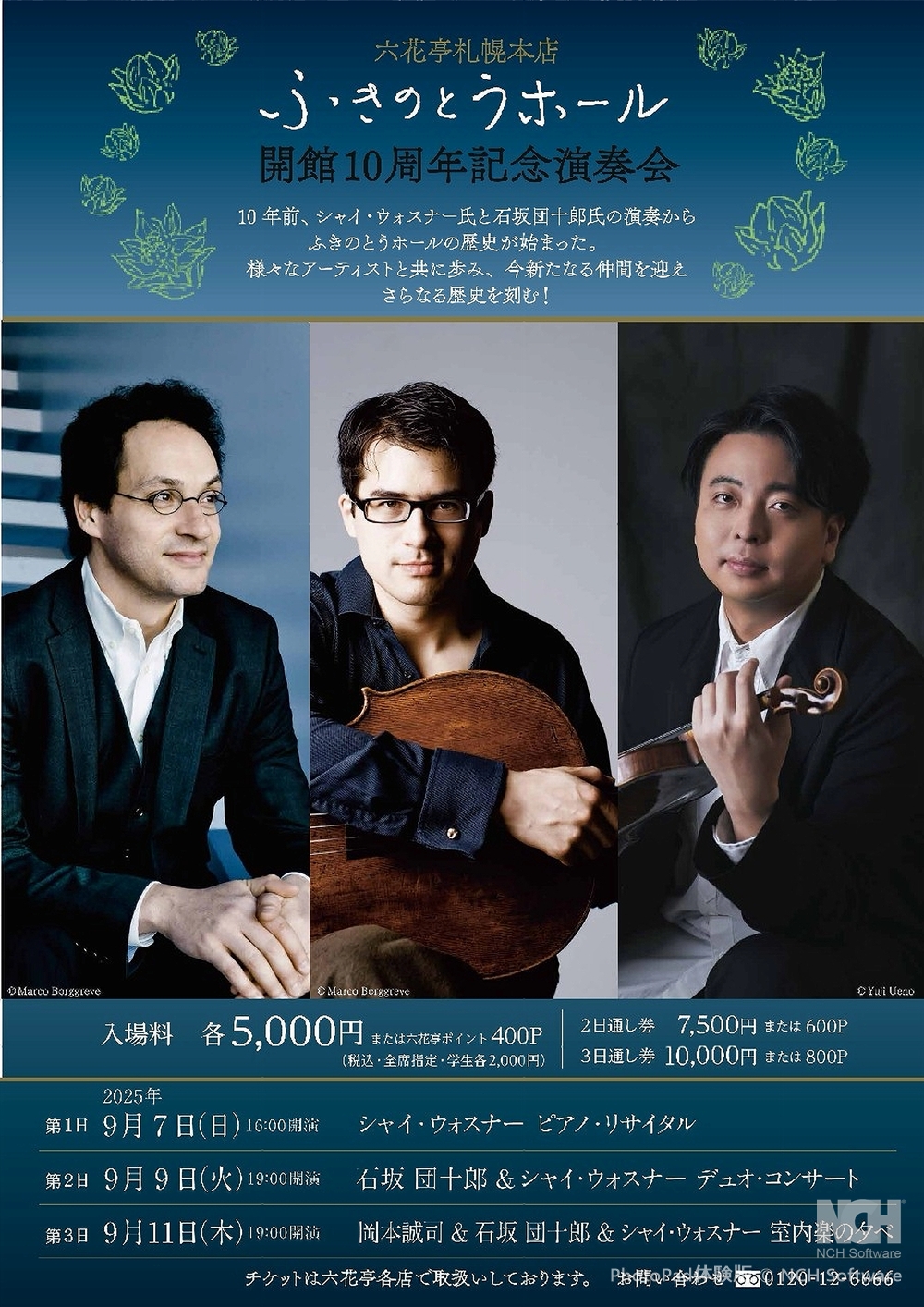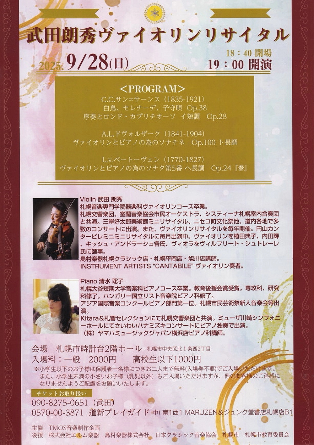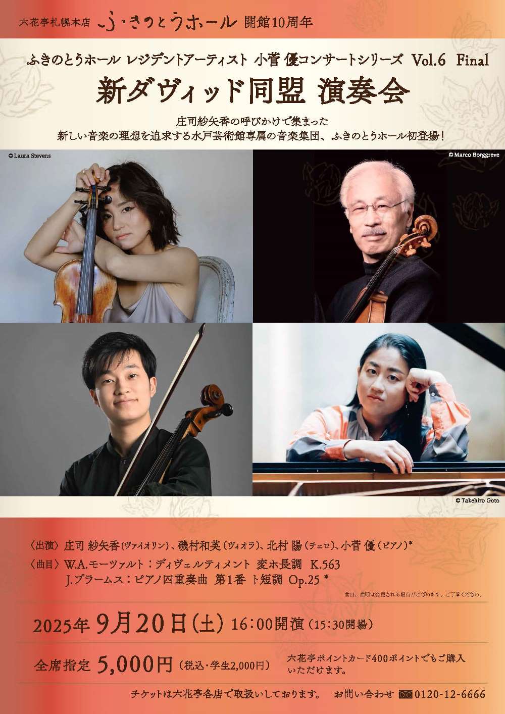 ふきのとうホール開館10周年記念演奏会 9月11日(木)開演19:00 ふきのとうホール(札幌市中央区北4条西6丁目3-3六花亭札幌本店6階) 出演 ヴァイオリン/岡本 誠司(ドイツ・ハンス・アイスラー音楽大学講師) チェロ/石坂 団十郎(スイス・バーゼル音楽院&ドイツ・ベルリン芸術大学チェロ科教授) ピアノ/シャイ・ウォスナー(ジュリアード音楽院講師) 曲目 W.A.モーツァルト/ヴァイオリンとヴィオラのための二重奏曲変ロ長調K424(ヴィオラとチェロ演奏版) E.メンデルスゾーン/ピアノ三重奏曲第2番ハ短調Op.66 J.ブラームス/ピアノ三重奏曲第2番ハ長調Op.87 |