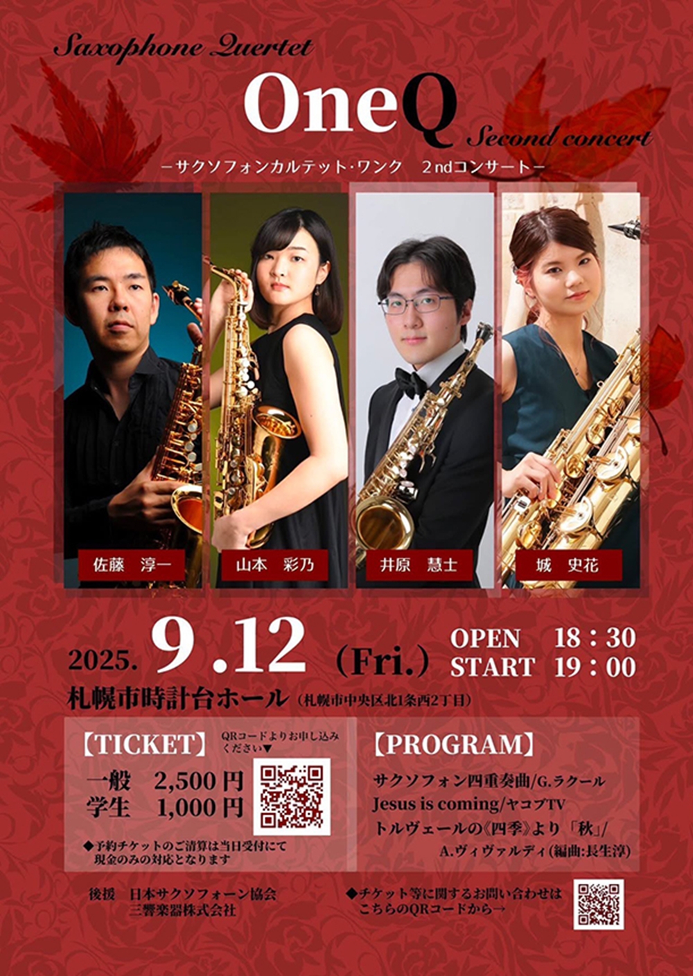 Saxophone QuertetDneQ Secand concert -サクソフォンカルテット・ワンク 2ndコンサート- 9月12日(金)19:00 札幌市時計台ホール(札幌市北1条西2丁目) 出演 サクソフォンカルテット・ワンク 佐藤 淳一、山本 綾乃、井原 慧士、城 史花 曲目 G.クラーク/サクソフォン四重奏曲 ヤコブTV/Jesus coming A.ヴィヴァルディ(長生淳編曲)/『トルヴェールの《四季》』より「秋」 |