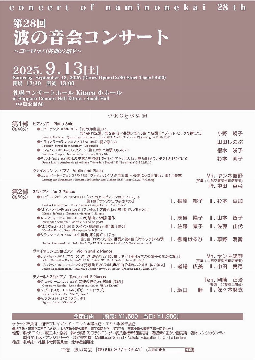 concert of naminonekai 28th第28回波の音会コンサート ~ヨーロッパ名曲の旅Ⅴ~ 9月13日(土)13:00 札幌コンサートホールKitara小ホール 演奏曲・出演者 第1部 ピアノソロ(約40分) F.プーランク/『15の即興曲』より第1番ロ短調、第2番変イ長調、第15番ハ短調「エディット・ピアフを讃えて」:小野 規子 K.S.クライスラー=ラフマニノフ/愛お悲しみ:山田しのぶ F.ショパン/ノクターン第13番ハ短調Op.48-1:植木 咲子 F.リスト/巡礼の年第2年補遺「ヴェネツィアとナポリ」より第3曲「タランテラ」S.162/R.10:杉本 萌子 ヴァイオリンとピアノ L.v.ベートーヴェン/ヴァイオリンソナタ第5番ヘ長調Op.24『春』より「第1楽章」「第4楽章」 第2部 2台ピアノ(約60分) C.グアスタピー/『3つのアルゼンチンのロマンス』より第1番「サンタフェの少女たち」:1Ⅰ.梅原 陽子、Ⅱ.杉本 由花 M.インファンテ/『アンダルシア舞曲』より第1番「リズミックに」 A.スクリャービン/幻想曲イ短調遺作:Ⅰ.茂泉 陽子、Ⅱ.山本 智子 M.ラヴェル/『スペイン狂詩曲』より:Ⅰ.佐藤 景子、Ⅱ.佐藤 佳代 S.ラフマニノフ/『組曲第2番Op.17』より「第3曲「ロマンス」変イ長調」「第4曲「タランテラ」ハ短調」:Ⅰ.櫻庭はるひ、Ⅱ.草野 清香 ヴァイオリンと2台ピアノ:Vn.ヤンネ舘野(客演、山形交響楽団ヴァイオリン首席奏者)、Ⅰ.道場 広美、Ⅱ.中田 真弓 J.S.バッハ/『カンタータBWV127』第3曲アリア「魂はイエスの御手のなかに想う」 J.S.バッハ/『マタイ受難曲BWV244』第39曲「憐れみたまえ、私の神よ」 テノールと2台ピアノ:Ten.岡崎 正治(客演。北海道二期会)、Ⅰ.坂口 睦、Ⅱ.佐々木麻衣 G.ロッシーニ/『音楽の夜会』より第8曲「踊り」 N.ブロドスキー/『ピー・マイ・ラブ』 A.ララ/『グラナダ』 |