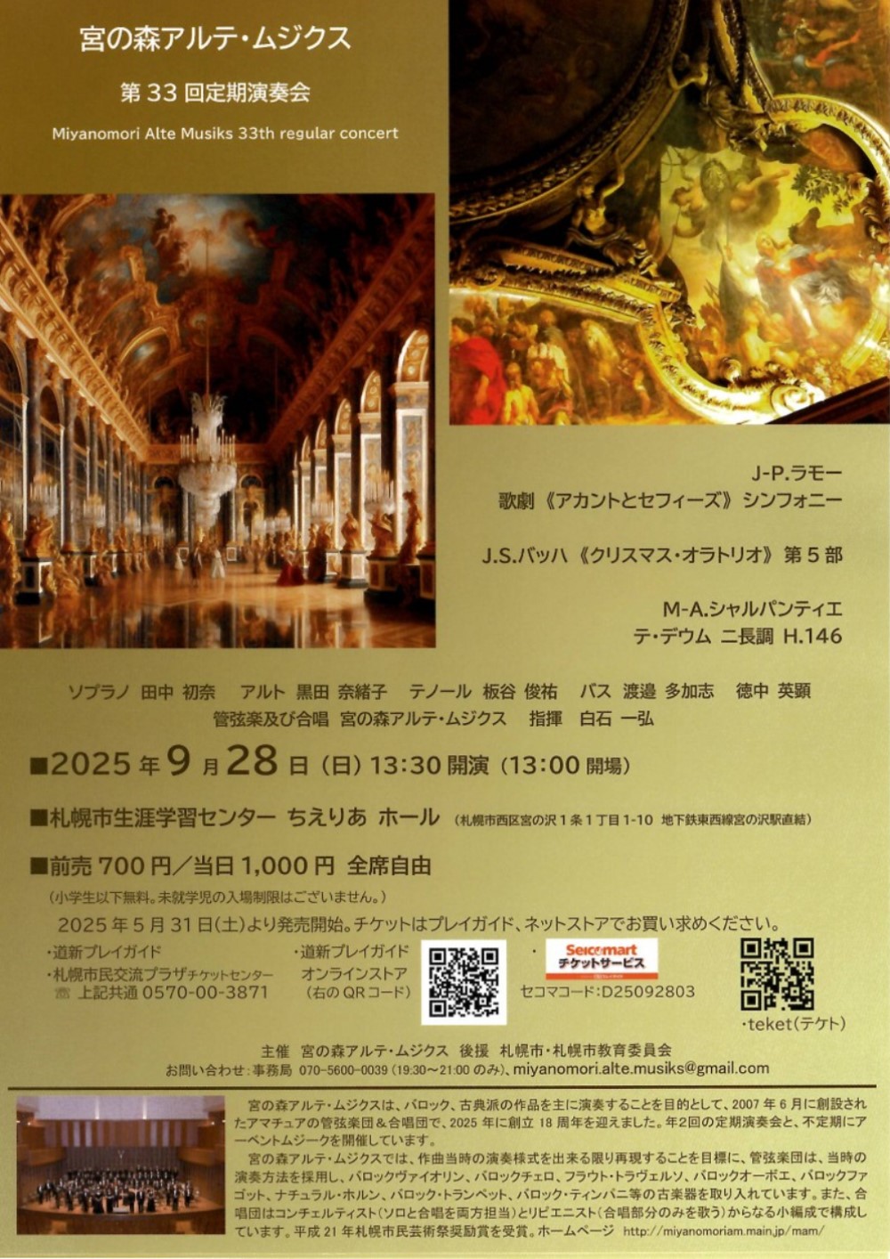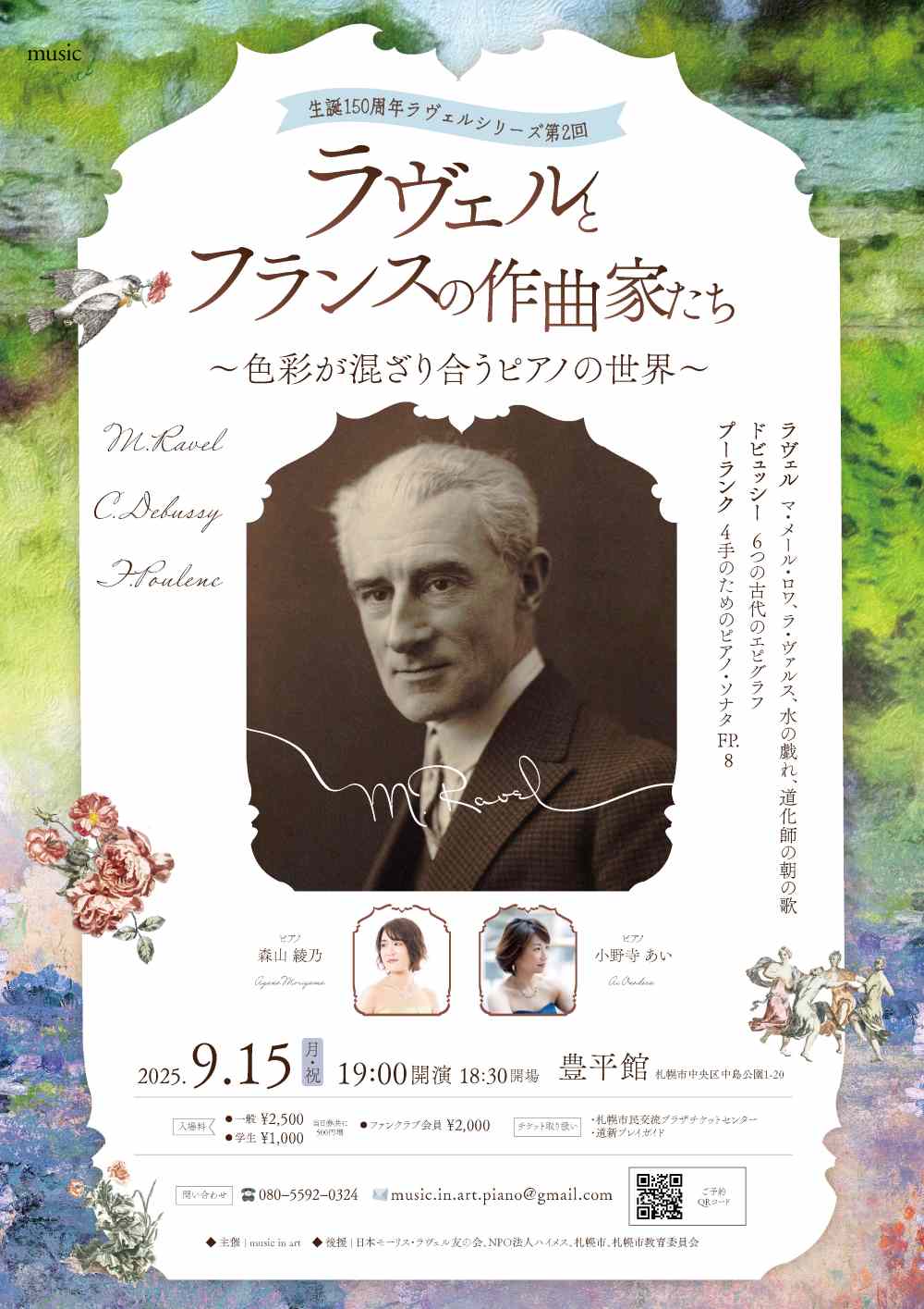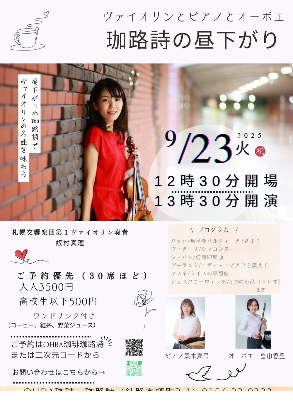 Concert 2025 ~新しい仲間と共に~ 9月5日(金)19:00 札幌コンサートホールKitara小ホール 出演・曲目 ≪新人≫ ◇ソプラノ/池田 莉茄、ピアノ/三輪 栞(賛助出演) スキーラ/夢 詩:中原中也、曲:木下牧子/『古風な月』より「湖上」 ・・・他 ◇ピアノ/馬場 春英(賛助出演) アリルド・ブラウ/チューバ協奏曲 ◇オーボエ/藤原 優花、ピアノ/小西 真奈 サン=サーンス/オーボエソナタOp.166 ≪会員≫ ◇ピアノ/住友 奈苗 シューマン/謝肉祭Op.9 ◇ソプラノ/板垣 恵、フルート/末次 直子、ピアノ/吉田 美香 ヘンデル/私を泣かせてください ベネディクト/ラ・カピネラ ◇ソプラノ/三浦 宏予、ピアノ/奥出かおり ヴェルディ/歌劇『運命の力』より「神よ平和を与えたまえ」 ブッチーニ/歌劇『蝶々夫人』より第2章 間奏曲「ある晴れた日に」(ピアノソロ) |