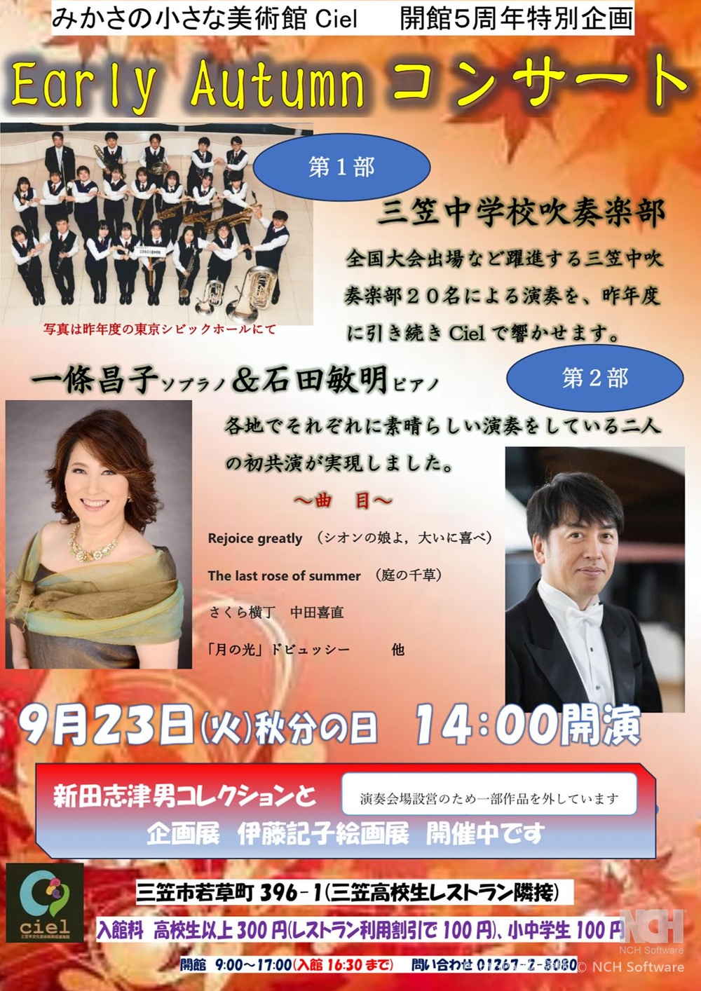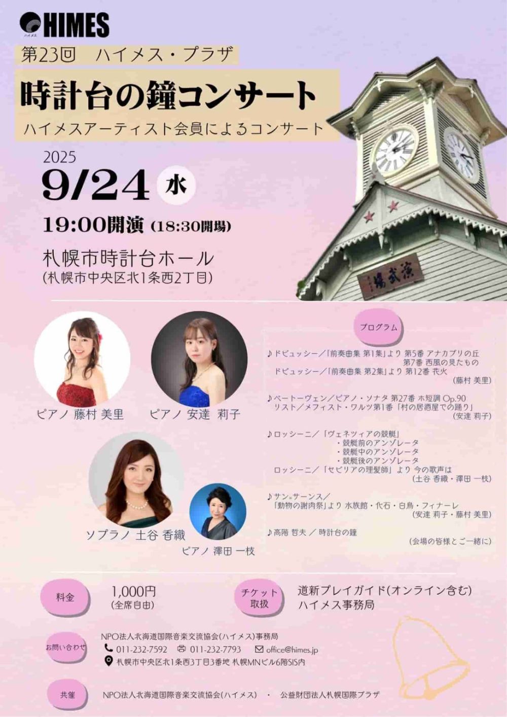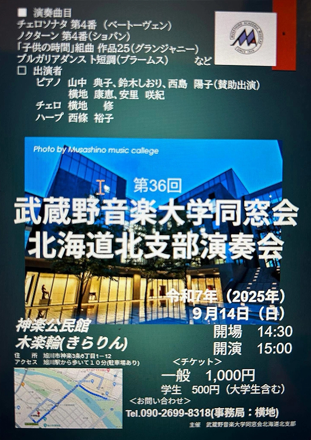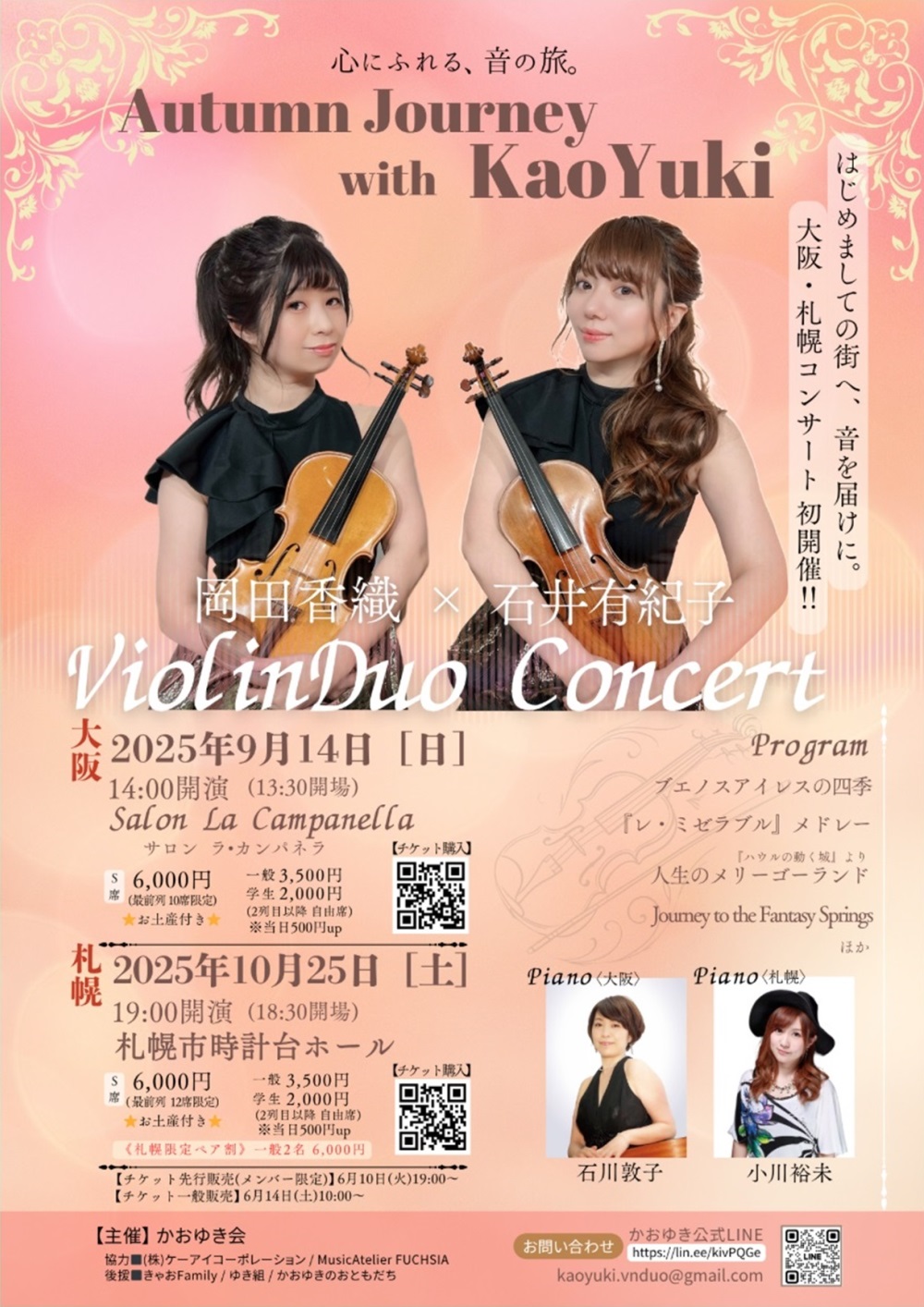 Concert 2025 ~新しい仲間と共に~ 9月5日(金)19:00 札幌コンサートホールKitara小ホール 出演・曲目 ≪新人≫ ◇ソプラノ/池田 莉茄、ピアノ/三輪 栞(賛助出演) スキーラ/夢 詩:中原中也、曲:木下牧子/『古風な月』より「湖上」 ・・・他 ◇ピアノ/馬場 春英(賛助出演) アリルド・ブラウ/チューバ協奏曲 ◇オーボエ/藤原 優花、ピアノ/小西 真奈 サン=サーンス/オーボエソナタOp.166 ≪会員≫ ◇ピアノ/住友 奈苗 シューマン/謝肉祭Op.9 ◇ソプラノ/板垣 恵、フルート/末次 直子、ピアノ/吉田 美香 ヘンデル/私を泣かせてください ベネディクト/ラ・カピネラ ◇ソプラノ/三浦 宏予、ピアノ/奥出かおり ヴェルディ/歌劇『運命の力』より「神よ平和を与えたまえ」 ブッチーニ/歌劇『蝶々夫人』より第2章 間奏曲「ある晴れた日に」(ピアノソロ) |
