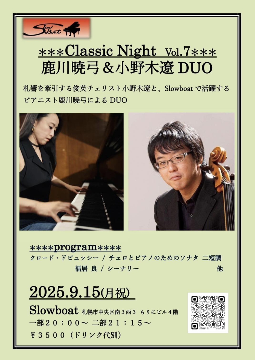 ふきのとうホール開館10周年記念演奏会 9月9日(火)開演19:00 ふきのとうホール(札幌市中央区北4条西6丁目3-3六花亭札幌本店6階) 出演 チェロ/石坂団十郎(スイス・バーゼル音楽院&ドイツ・ベルリン芸術大学チェロ科教授) ピアノ/シャイ・ウォスナー(ジュリアード音楽院講師) 曲目 R.シューマン/幻想小曲集Op.73 J.S.バッハ/無伴奏チェロ組曲第1番ト長調BWV1007 C.ドビュッシー/チェロ・ソナタニ短調 A.ジョリヴェ/ノクターン C.フランク/ヴァイオリン・ソナタイ長調(チェロとピアノ演奏版) |