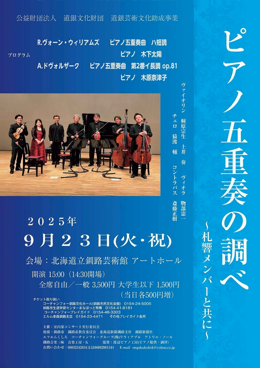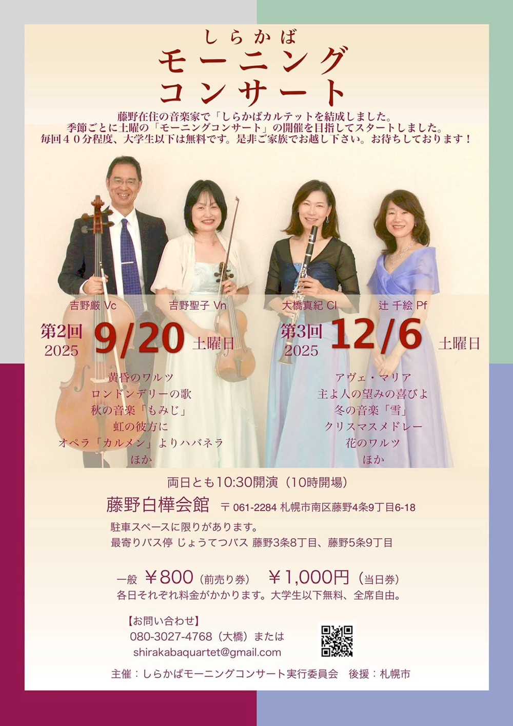 イベント開始支援事業 令7イ-2号 音楽の散歩道 ~チェロの名曲によせて~ Vol.3アンサンブルの愉しみ 9月7日(日)14:00 奈井江町文化ホールコンチェルトホール(空知郡奈井江町本町2区) 出演 ピアノ/倉戸 テル チェロ/藤原 真理 クラリネット/遠藤 文江 曲目 ブラームス/クラリネット三重奏曲イ短調作品114 ベートーヴェン/ピアノ三重奏曲第4番変ロ長調作品11「街の歌」 チェロの名曲小品から |