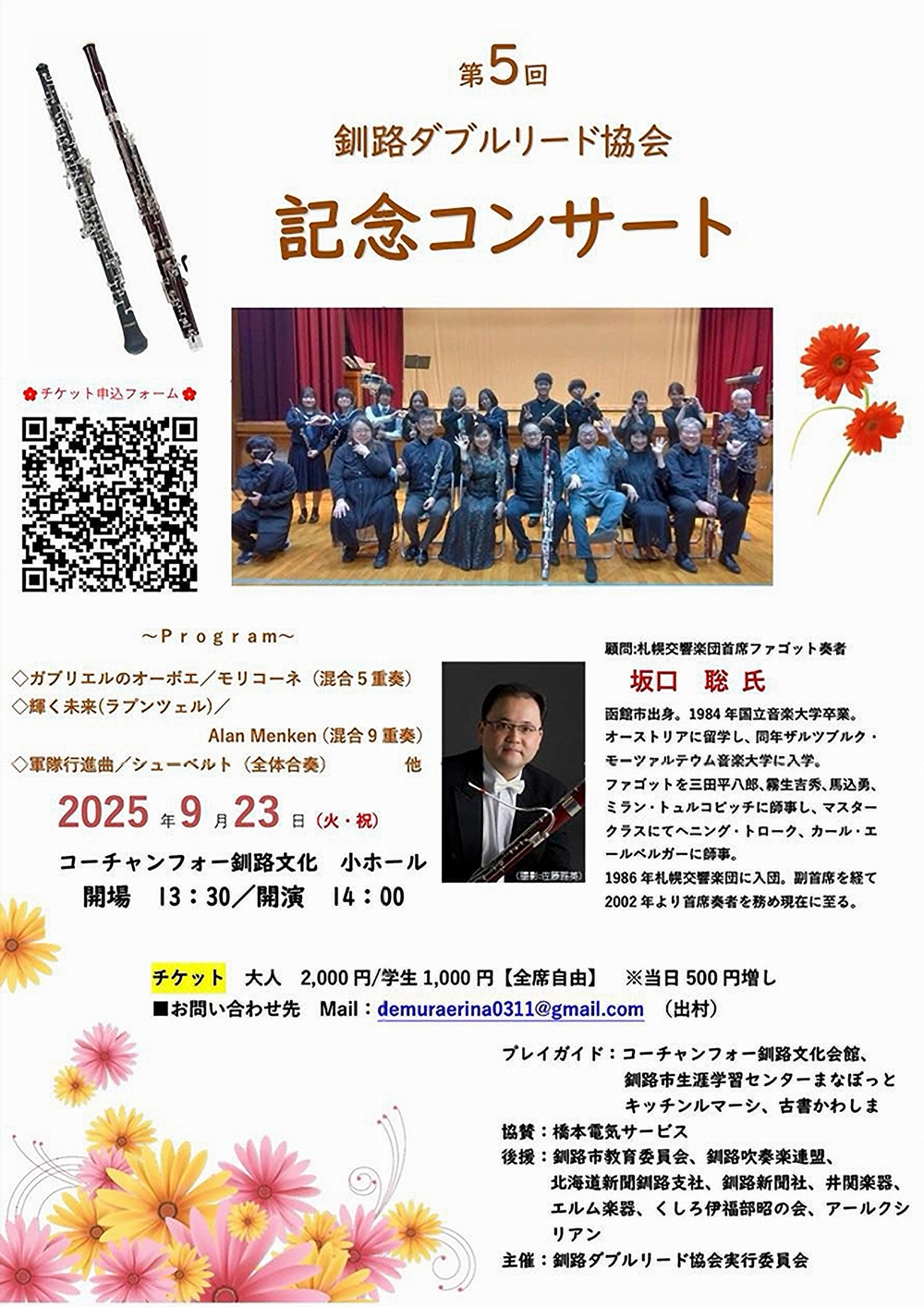 ~フルート共に40年~Salon Concert 9月6日(土)昼公演 13:30 夕公演 17:00 CREEK HALL(札幌市西区発寒6条9丁目11-28) 出演 フルート/薄田 麻希 ピアノ/澤瀉 雅子 曲目 グルック/精霊の踊り プライヤー/口笛吹きと犬 ポルヌ/カルメン幻想曲 ヴィヴァルディ/ごしきひわ ショッカー/後悔と決心 ・・・他 |