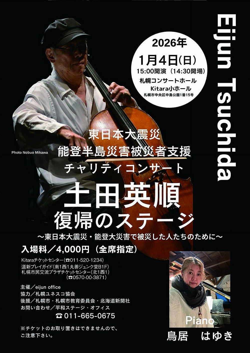 東日本大震災・能登半島災害被害者支援チャリティコンサート 土田英順 復帰のステージ 〜東日本大震災・能登大災害で 被災した人たちのために〜 1月4日(日)15:00 札幌コンサートホールKitara小ホール 出演 チェロ/土田 英順(元札響チェロ首席奏者) ピアノ/鳥居はゆき(フリーランスピアニスト) 曲目 第1部 F.M.ヴェラチーニ/ラルゴ G.カッチーニ/アヴェ・マリア C.グノー/アヴェ・マリア F.シューベルト/アヴェ・マリア F.ショパン/チェロ・ソナタOp.65第3楽章 F.ショパン/ノクターン第20番 F.ショパン/ノクターン第2番 第2部 S.ラフマニノフ/ヴォカリーズOp.34-14 A.ピアソラ/ブエノスアイレスの四季 |