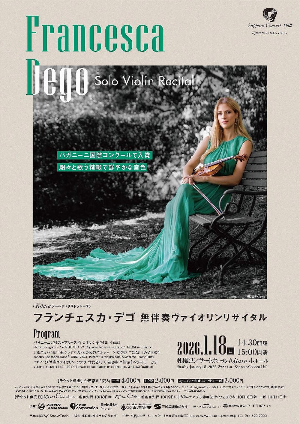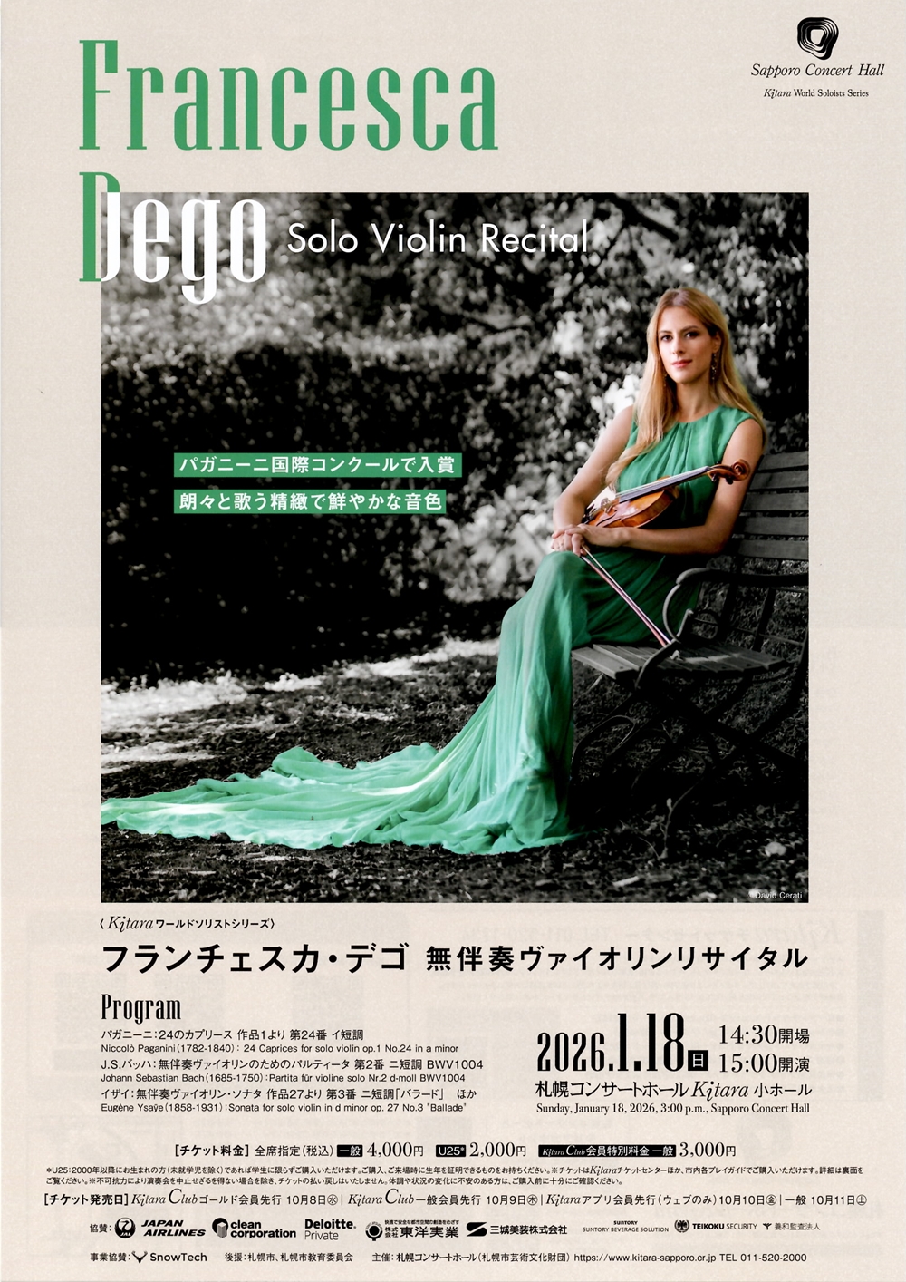 Kitaraワールドソリストシリーズフランチェスカ・デゴ 無伴奏ヴァイオリンリサイタル 1月18日(日)15:00 札幌コンサートホールKitara小ホール 出演 ヴァイオリン/フランチェスカ・デゴ プログラム 作者不詳(14世紀イタリア)/トリスタンの哀歌、ラ・ロッタ カルロ・ボッカドーロ:仮想(世界初演、デゴ委嘱作品) タルティーニ/無伴奏ヴァイオリン・ソナタ第13番ロ短調 フランチェスコ・アントニオーニ/ジュリアの瞳(日本初演、デゴ委嘱作品) パガニーニ/24のカプリース作品1より第13番変ロ長調、第16番ト短調 ニコラ・カンポグランデ/指を動かしながら歩く(世界初演、デゴ委嘱作品) パガニーニ/24のカプリース作品1より第17番変ホ長調、第24番イ短調 J.S.バッハ/無伴奏ヴァイオリンのためのパルティータ第2番ニ短調BWV1004 イザイ/無伴奏ヴァイオリン・ソナタ作品27より第3番ニ短調「バラード」 |