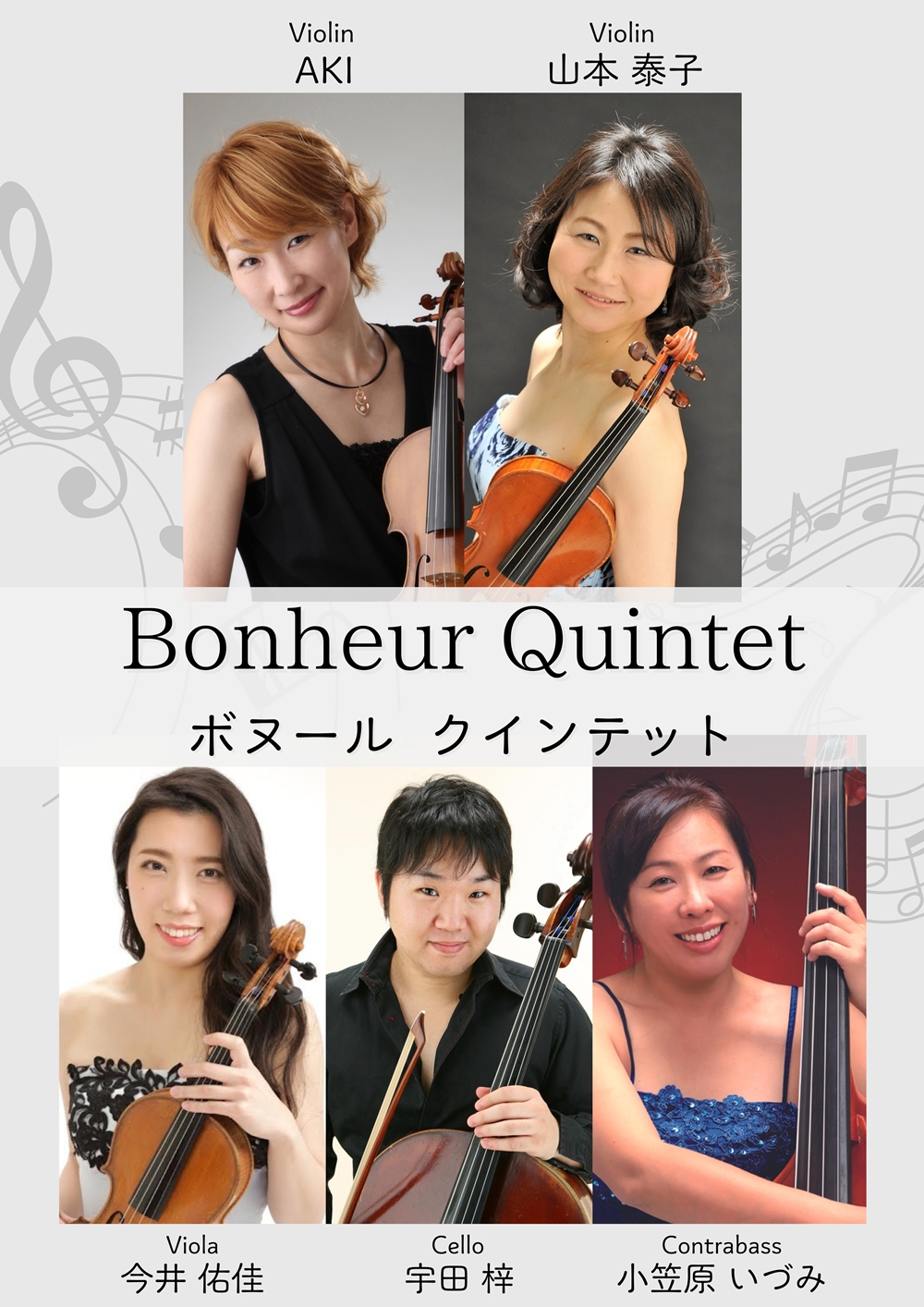 Bonheur Quintetボヌール・クインテット Concert Vol.3 1月8日(木)19:00 SCARTSコート(札幌市中央区北1条西1丁目札幌市民交流プラザ1階) 出演 ヴァイオリン/AKI、山本 泰子 ヴィオラ/今井 佑佳 チェロ/宇田 梓 コントラバス/小笠原いづみ 曲目 J.シュトラウス/美しき青きドナウ、踊り明かそう 久石譲/風の谷のナウシカ組曲 宮城道雄/春の海 ・・・ほか |