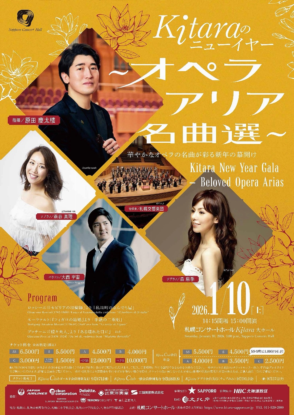 Kitaraのニューイヤー1月10日(土)15:00 札幌コンサートホールKitara大ホール 出演 指揮/原田慶太楼(東京交響楽団正指揮者) ソプラノ/森 麻季(国立音楽大学客員教授)〇 ソプラノ/森谷 真理(東京藝術大学講師)◇ バリトン/大西 宇宙(令和5年度(第74回)芸術選奨文部科学大臣新人賞受賞)★ 管弦楽/札幌交響楽団 曲目 ロッシーニ/『セビリアの理髪師』より序曲「私は町のなんでも屋」★ モーツァルト/『フィガロの結婚』より「手紙の二重唱」〇◇ ヴェルディ/『椿姫』より「ヴィオレッタとジェルモンの二重唱」〇★ レオンカヴァッロ/『道化師』より「鳥の歌」◇、「ネッダ!シルヴィオ!こんな時間に…?」◇★ ドヴォルザーク/『ルサルカ』より「月に寄せる歌」〇 コルンゴルト/『死の都』より「ピエロの歌」★ プッチーニ/『ラ・ボエーム』より「私が町を歩けば」◇ 『蝶々夫人』より「ある晴れた日に」〇 マスネ/『タイス』より「タイスの瞑想曲にのせて」〇★ 、「あなたは覚えているかしら?あの光輝く旅を」〇★ |