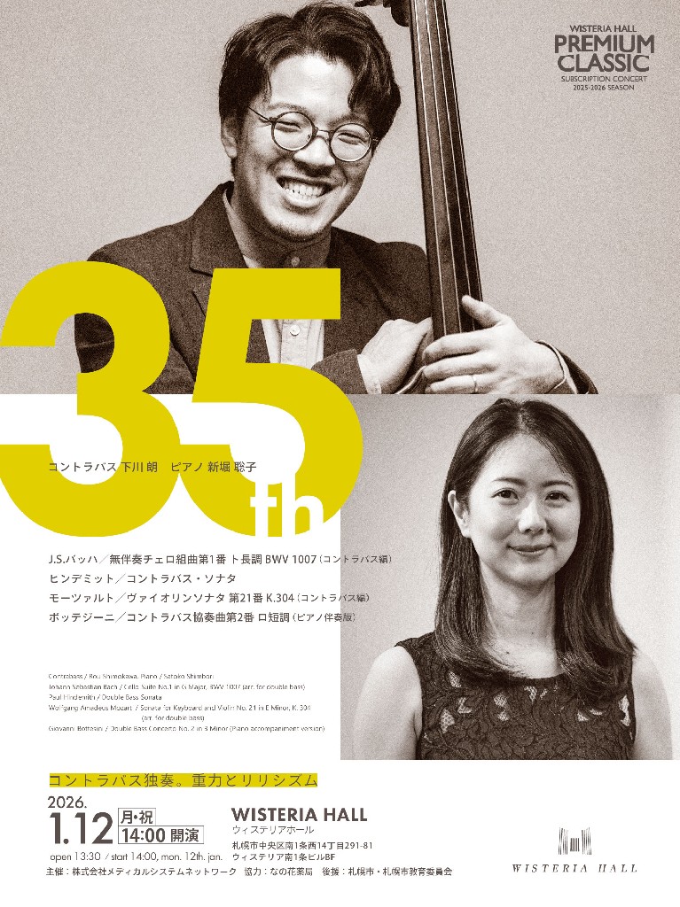 WISTERIA HALLPREMIUM CLASSIC 35th SUBSCRIPTION CONCERT 2025-2026 SEASON ウィステリアホールプレミアムクラシック35th サブスクリプションコンサート2025-2026シーズン コントラバス独奏。重力とリリシズム 1月12日(月・祝)14:00 ウィステリアホール(中央区南1条西14丁目291-81ウィステリア南1条ビルBF) 出演 コントラバス/下川 朗(札響コントラバス奏者) ピアノ/新堀 聡子(ウィステリアホールミュージックデレクター) 曲目 J.S.バッハ/無伴奏チェロ組曲第1番ト長調BWV1007(コントラバス編) ヒンデミット/コントラバス・ソナタ モーツァルト/ヴァイオリンソナタ第21番K.304(コントラバス編) ポッテジーニ/コントラバス協奏曲第2番ロ短調(ピアノ伴奏版) |