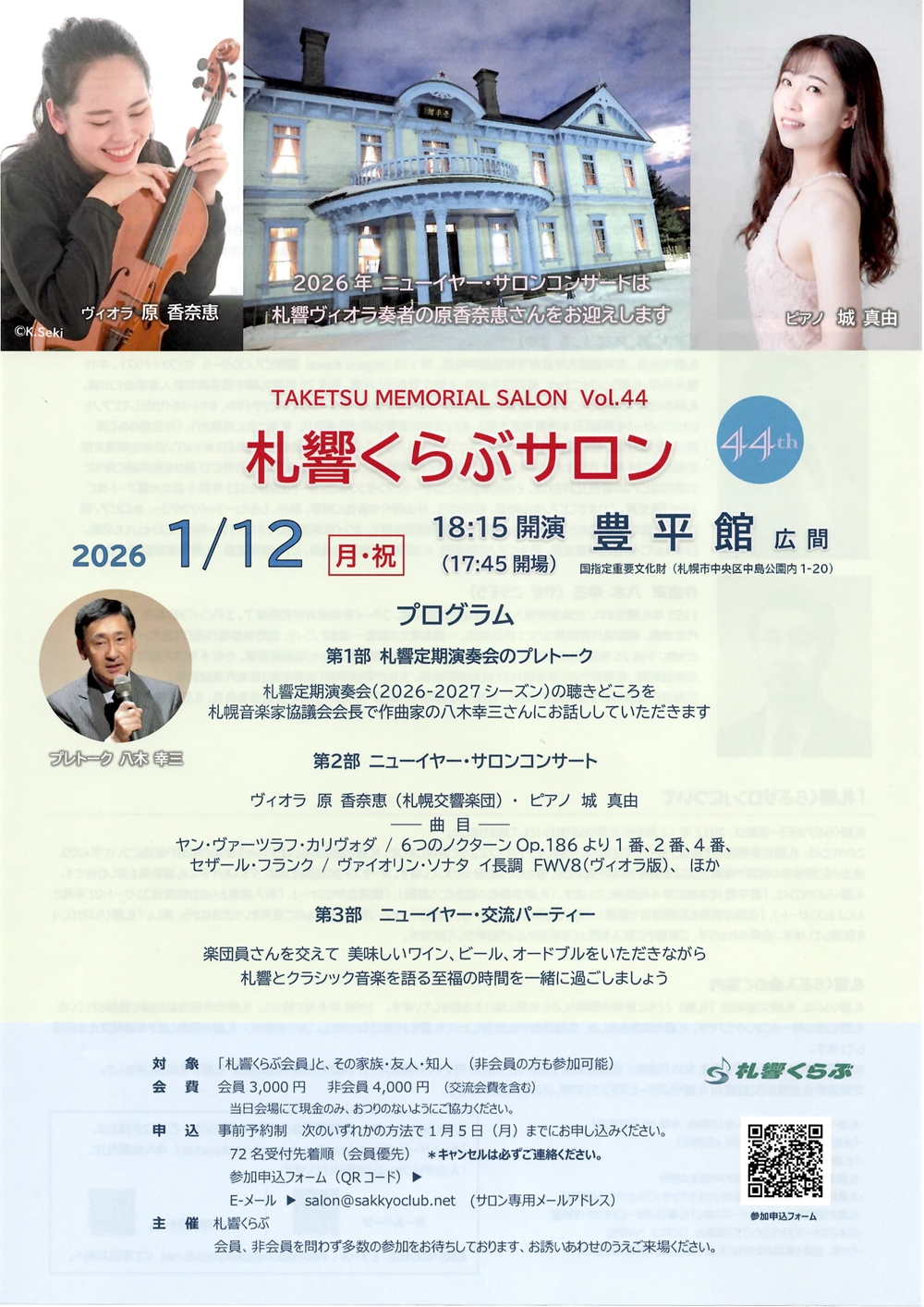 札響くらぶサロン 1月12日(月・祝)18:15 国指定重要文化財「豊平館」(札幌市中央区中島公園1-20) プログラム 第1部 札響定期演奏会プレトーク 札響定期演奏会(2026〜2027)の聞きどころ 講師/八木 幸三(北海道音楽家協議会会長&札響くらぶ顧問) 第2部 ニュー・イヤー・コンサート 出演 ヴィオラ/原 香奈恵(札響ヴィオラ副首席奏者) ピアノ/城 真由(カワイ音楽教室アドバイザー兼ピアニスト)) 曲目 ヤン・ヴァーツラフ・カリヴォダ/6つのノクターンOp.186より第1番、第2番、第4番 セザール・フランク/ヴァイオリン・ソナタイ長調FWV8(ビオラ版) ……他 第3部 ニューイヤー・交流パーティー 札響楽員とおいしいオードブル等をいただきながら札響と音楽を語る至福の時間をお楽しみください。 |