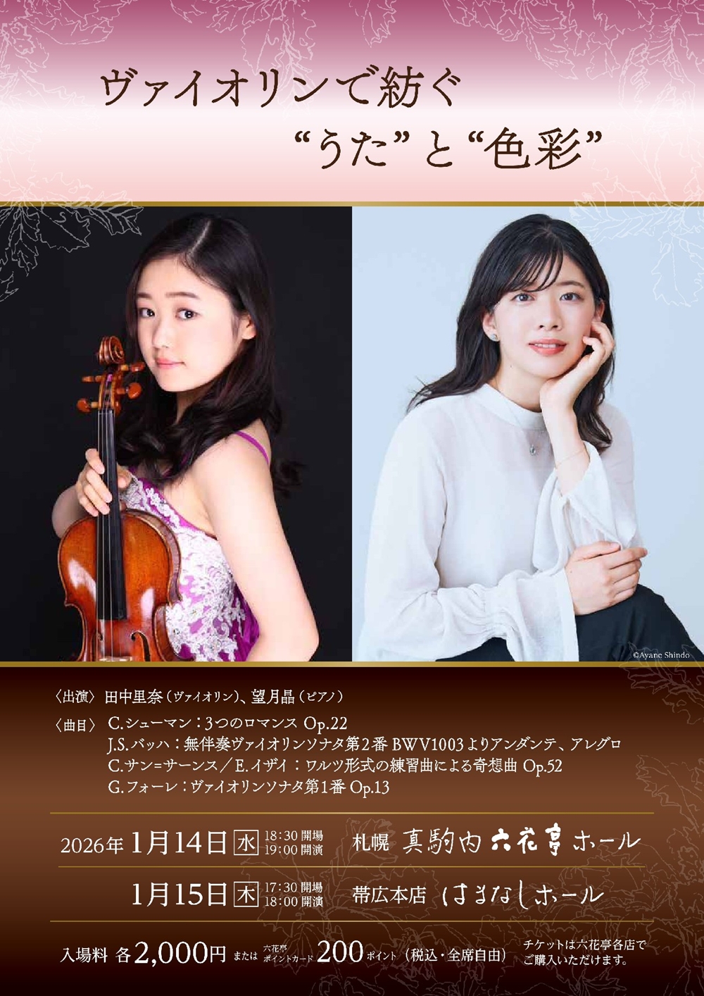 ヴァイオリンで紡ぐ“うた”と“色彩” 1月14日(水) 19:00 真駒内六花亭ホール(札幌市南区真駒内上町1丁目15-16-2) 出演 ヴァイオリン/田中 里奈(東邦学園大学ソリスト・ディプロマコース1年債学中) ピアノ/望月 晶(桐朋学園大学音楽学部修士課程修了) 曲目 C.シューマン/3つのロマンスOp.22 J,S.バッハ/『無伴奏ヴァイオリンソナタ第2番BWV1003』より「アンダンテ」「アレグロ」 C.サン=サーンス・E.イザイ/ワルツ形式の練習曲による奇想曲Op.52 G.フォーレ/ヴァイオリンソナタ第1番Op.13 |