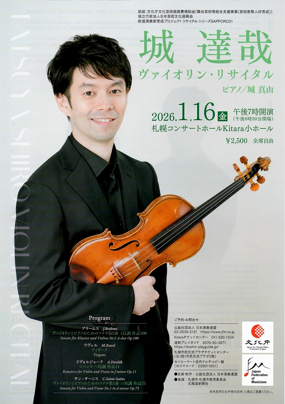 ヴァイオリン・リサイタル TATSUYA SHIRO VIOLIN・RICITAL 1月16日(金)19:00 札幌コンサートホールKitara小ホール 出演 ヴァイオリン/城 達哉(フリーランスヴァイオリン奏者) ピアノ/城 真由(カワイ音楽教室アドバイザー兼ピアニスト) 曲目 ブラームス/ヴァイオリンとピアノのためのソナタ第2番イ長調作品100 ラヴェル/ツィガーヌ ドボルジャーク/ロマンスヘ短調作品11 サン=サーンス/ヴァイオリンとピアノのためのソナタ第1番ニ短調作品75 |