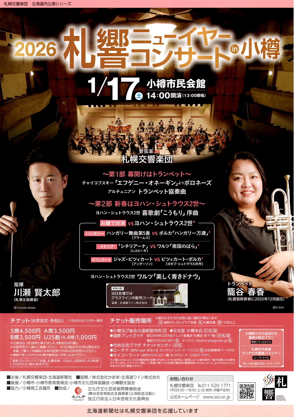 札響ニューイヤーコンサート in 小樽 1月17日(土)14:00 小樽市民会館(小樽市花園5丁目3-1) 出演 指揮/川瀬賢太郎(札響正指揮者) トランペット/籠谷 春香(札響副首席奏者) 管弦楽/札幌交響楽団 曲目 チャイコフスキー/歌劇『エフゲニー・オネーギン』より「ポロネーズ」 アルチュニアン/トランペット協奏曲 ブラームス/ハンガリー舞曲第5番 レスピーギ/『リュートのための古風な舞曲とアリア』第3組曲より「シチリアーナ」 アンダーソンジャズ・ピツィカート ヨハン・シュトラウス2世/喜歌劇「こうもり」序曲 ヨハン・シュトラウス2世/ポルカ「ハンガリー万歳」 ヨハン・シュトラウス2世/ピツィカート・ポルカ(ヨーゼフ・シュトラウス共作) ヨハン・シュトラウス2世/ワルツ「南国のばら」、 ヨハン・シュトラウス2世/ワルツ「美しく青きドナウ」 |