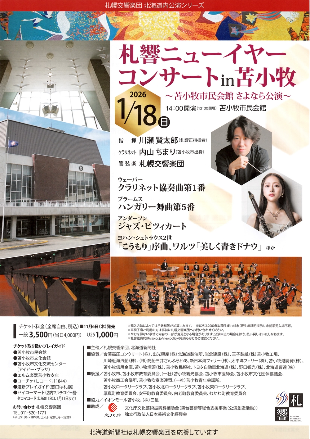 札響ニューイヤコンサート in 苫小牧 〜苫小牧市民会館 さよなら公演〜 1月18日(日)14:00 苫小牧市民会館(苫小牧市旭町3丁目2番2号) 出演 指揮/川瀬賢太郎(札響正指揮者) クラリネット/内山 ちまり 管弦楽/札幌交響楽団 曲目 チャイコフスキー/歌劇『エフゲニー・オネーギン』より「ポロネーズ」 ウェーバー/クラリネット協奏曲第1番 ブラームス/ハンガリー舞曲第5番 レスピーギ/『リュートのための古風な舞曲とアリア』第3組曲より「シチリアーナ」 アンダーソン/ジャズ・ピツィカート ヨハン・シュトラウス2世/喜歌劇「こうもり」序曲 ヨハン・シュトラウス2世/ポルカ「ハンガリー万歳」 ヨハン・シュトラウス2世/ピツィカート・ポルカ(ヨーゼフ・シュトラウス共作) ヨハン・シュトラウス2世/ワルツ「南国のばら」、 ヨハン・シュトラウス2世/ワルツ「美しく青きドナウ」 |