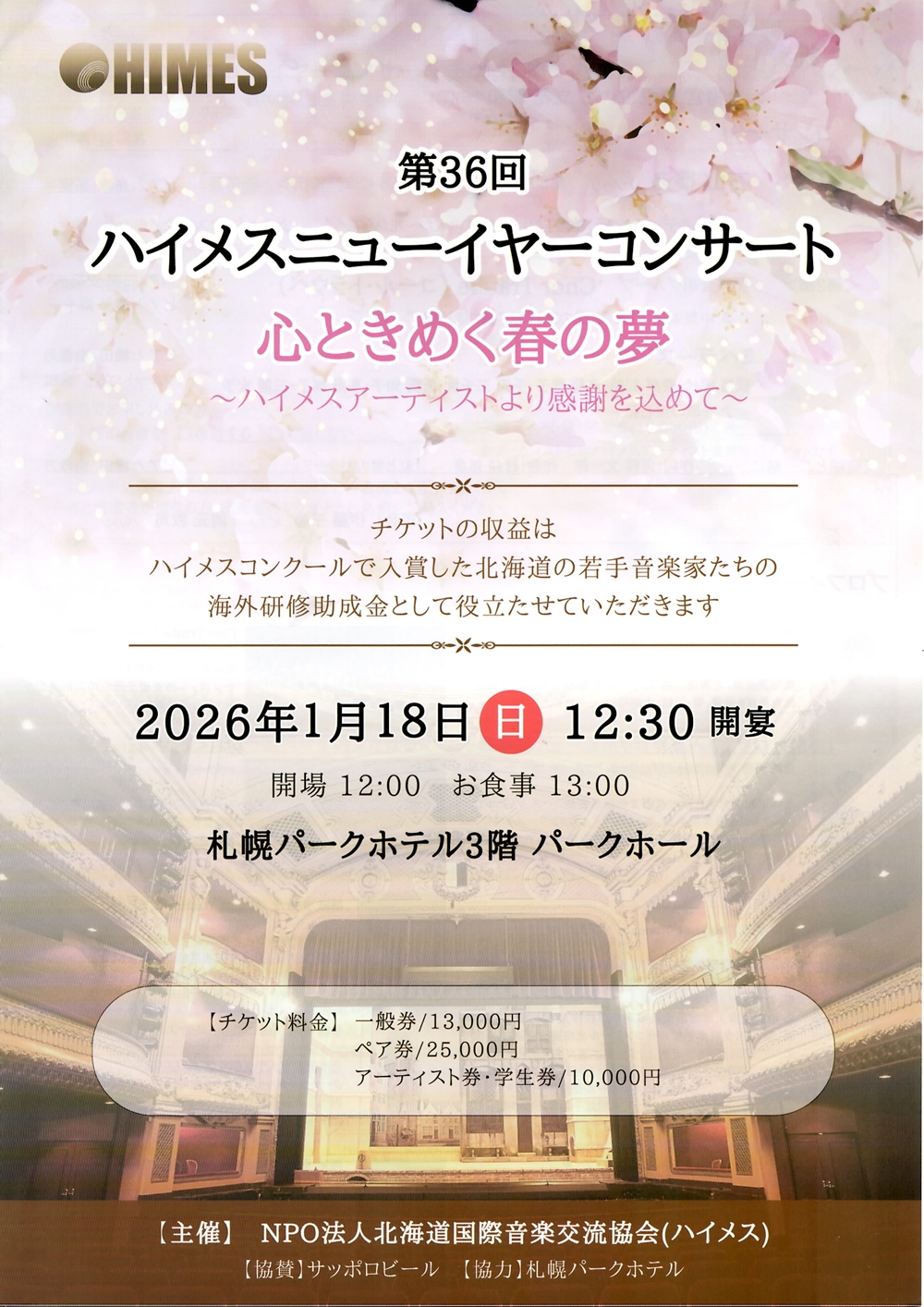心ときめく春の夢 〜ハイメスアーティストより感謝をこめて〜 1月18日(日)12:30 札幌パークホテル3階パークホール 祝奏 箏/梅宮 恵理 フルート/立花 雅和 ♪宮城道雄/春の海 コンサート 第1部 出演 ソプラノ/石山 夢乃(第37回ハイメスコンクール<声楽部門>優秀賞 ピアノ/島津 拓実 ♪ヴェルディ/オペラ『椿姫』より「そは彼の人か〜花から花へ」 ♪シュトラウスU世/春の声 ……他 第2部 女声合唱グループChor Traube(コール・トラウベ) 指揮/三部安紀子 ピアノ/渡部麻千子 ♪中島はる/『萬葉・愛の歌』より「庭もほどろに」 ミベラーズ(北海道二期会所属女性ヴォーカルグループ) ピアノ/橘田由希乃 フルート/立花 雅和 女声合唱/笹尾 雅代、菅原 利美、高橋 雅子、千田三千世、新関 知子、平野 則子、三浦 宏子 ♪浜村淳/〜歌の宝石箱〜 <皆様とご一緒に> ピアノ/橘田由希乃(ヤマハミュージックジャパン札幌店ピアノ講師) ♪河野文一郎作詞・村井邦彦作曲/「虹と雪のバラード」 司会/伊藤 千尋(ピアノ。第20回ハイメスコンクール第2位) 岡元 敦司(バリトン。北翔、北海道教育、札幌大谷各大学講師) |