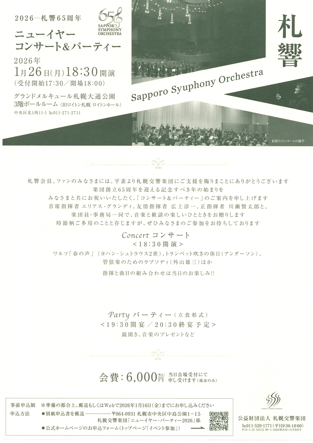 ニューイヤー コンサート&パーティー 1月26日(月)18:30 グランドメルキュール札幌大通公園3階ボールルーム((旧)ロイトン札幌ロイトンホール。札幌市中央区北1条西11丁目1) コンサート 指揮/エリアス・グランディ(首席指揮者) 指揮/広上 淳一(友情指揮者) 指揮/川瀬賢太郎(正指揮者) 楽団員、事務局一同 ヨハン・シュトラウス2世/ワルツ「春の声」 アンダーソン/トランペット吹きの休日 外山雄三/管弦楽のためのラプソディ ……他 ※指揮者と曲目の組み合わせは当日のお楽しみ!! パーティー(立食形式。19:30〜20:30) 鏡開き、音楽のプレゼントなど |