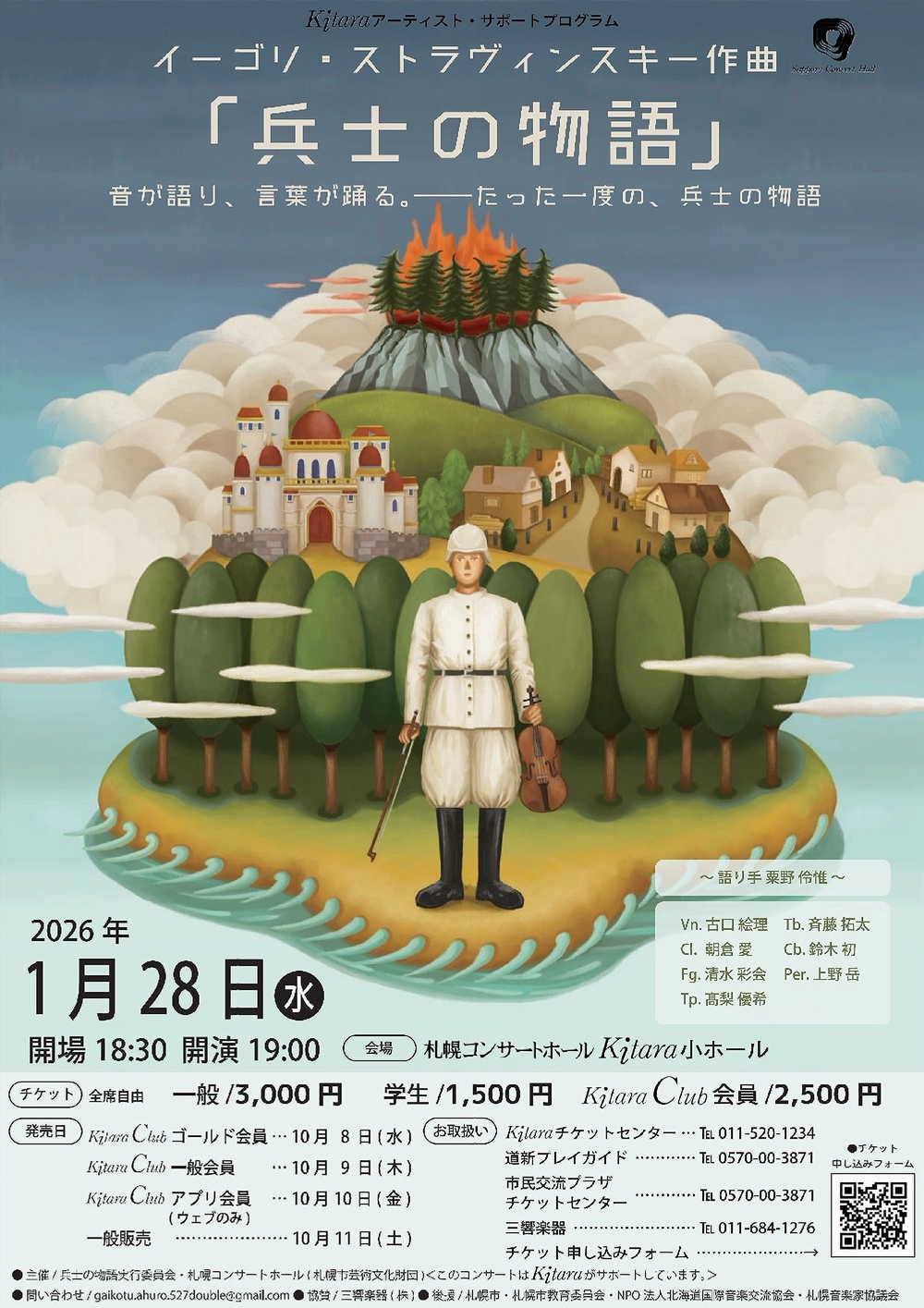 Kitaraアーティスト・サポートプログラムイーゴリ・ストラヴィンスキー作曲 「兵士の物語」 音が語り、言葉が踊る─たった一度の、兵士の物語 1月28日(水)19:00 札幌コンサートホールKitara小ホール 出演 語り手/粟野 伶惟 ヴァイオリン/古口 絵理(フリーランスヴァイオリン&ヴィオラ奏者) クラリネット/朝倉 愛(プロウインドオーケストラ北海道クラリネット奏者) ファゴット/清水 彩会(プロウインドオーケストラ北海道ファゴット奏者) トランペット/梨 優希(プロウインドオーケストラ北海道トランペット奏者) トロンボーン/斉藤 拓太(プロウインドオーケストラ北海道トロンボーン奏者) コントラバス/鈴木 初(札幌大田区大学芸術学部非常勤腰) 打楽器/上野 岳(プロウインドオーケストラ北海道打楽器奏者) プログラム ストラヴィンスキー/兵士の物語(語り付き) |