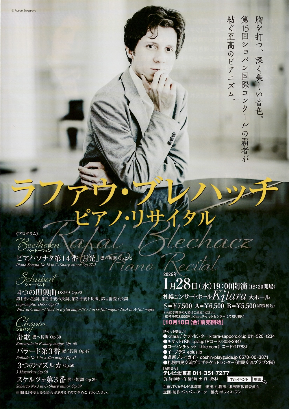 ラファウ・ブレハッチピアノ・リサイタル 1月28日(水)19:00 札幌コンサートホールKitara大ホール 出演 ピアノ/ラファウ・ブレハッチ(ドイツ・グラモフォン専属レコーディング・アーティスト) 曲目 ベートーヴェン/ピアノ・ソナタ第14番「月光」嬰ハ短調Op.27-2 シューベルト/4つの即興曲?99 Op.90「第1番ハ短調、第2番変ホ長調、第3番変ト長調、第4番変イ長調」 ショパン/舟歌英ヘ長調Op.60 ショパン/バラード第3番変イ長調Op.47 ショパン/3つのマズルカOp.50 ショパン/スケルツォ第3番嬰ハ短調Op.39 |