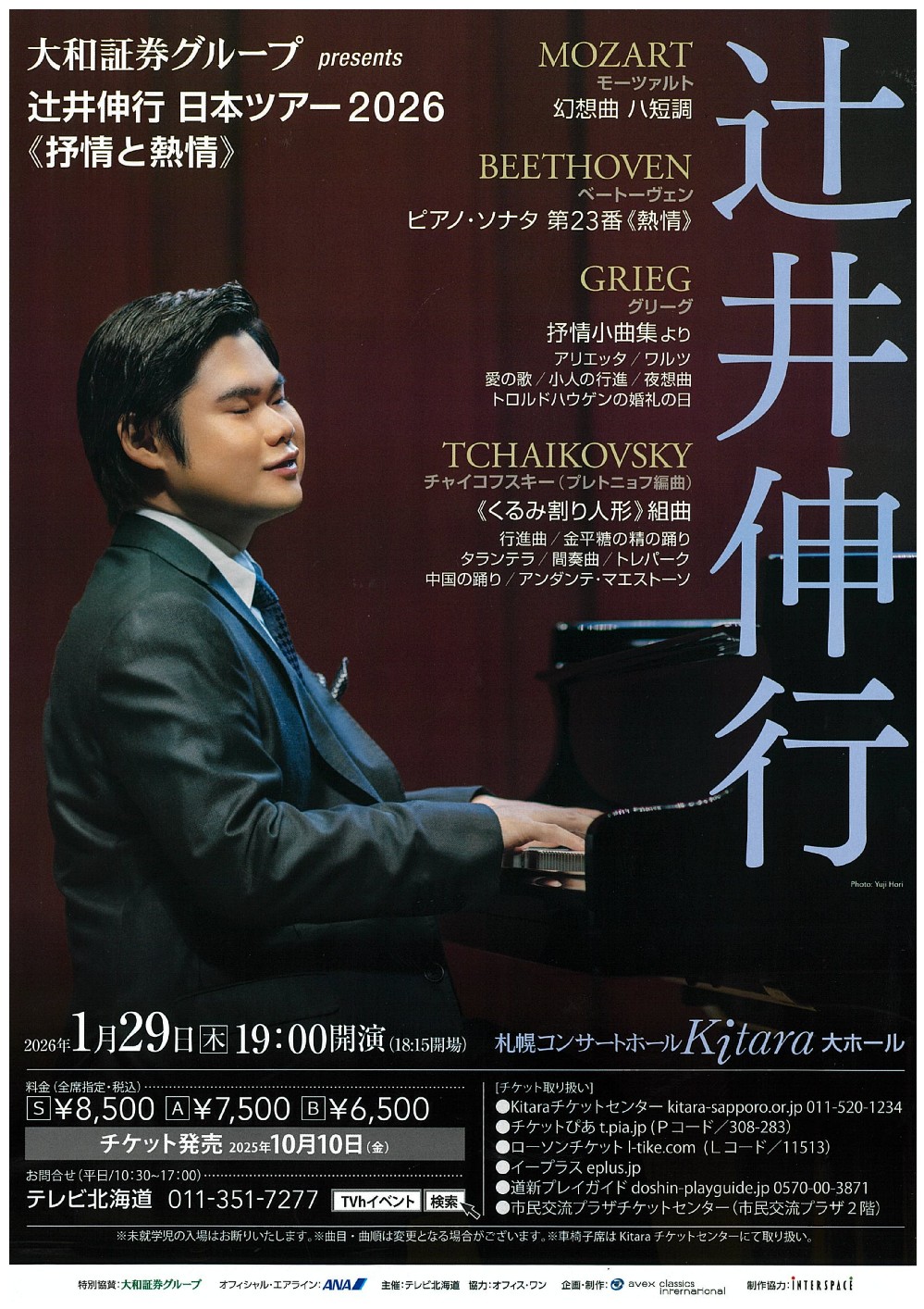 大和証券グループpresents辻井伸行 日本ツアー2026≪抒情と熱情≫ 札幌公演 1月29日(木)19:00 札幌コンサートホールKitara大ホール 出演 ピアノ/辻井 伸行(ARKフィルハーモニック レジデント・ピアニスト) 曲目 モーツァルト/幻想曲ハ短調 ベートーヴェン/ピアノ・ソナタ第23番「情熱」 グリーグ/『抒情小曲集』より「アリエッタ」「ワルツ」「愛の歌」「小人の行進」「夜想曲」「トロルドハウゲンの婚礼の日」 チャイコフスキー(プレトニョフ編曲)/『くるみ割り人形』組曲「行進曲」「金平糖の精の踊り」「タランテラ」「間奏曲」「トレパーク」「中国の踊り」「アンダンテ・マエストーソ」 |