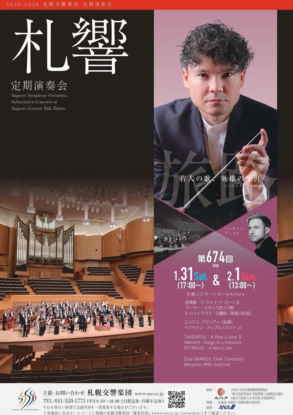 第674回定期演奏会 1月31日(土)A日程17:00 札幌コンサートホール大ホール 出演 指揮/エリアス・グランディ(札響首席指揮者) バリトン/ベンヤミン・アップル 管弦楽/札幌交響楽団 曲目 武満徹/ア・ウェイ・ア・ローン マーラー/さすらう若人の歌 R.シュトラウス/交響詩「英雄の生涯」 |