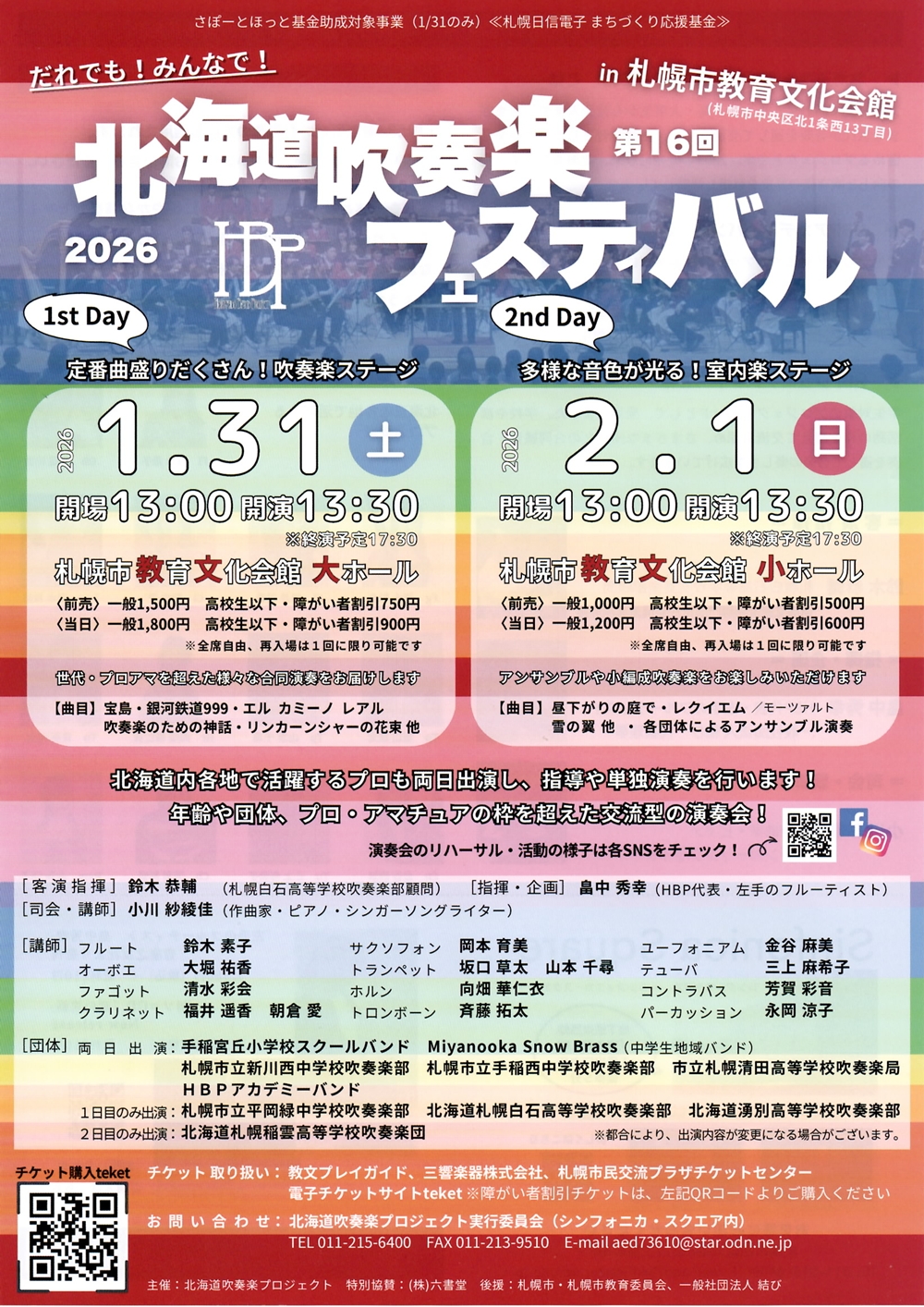 第16回北海道吹奏楽フェスティバルin 札幌市教育文化会館 1月31日(土)13:30〜17:30 札幌市教育文化会館大ホール(札幌市中央区北1条西13丁目7) 出演 客演指揮/鈴木 恭輔(札幌白石高等学校吹奏楽部顧問) 指揮・企画/「畠中 秀幸(HBP代表・左手のフルーティスト) 司会・講師/小川紗綾佳(作曲家・ピアノ・シンガーソングライター) 講師 フルート/鈴木 素子 オーボエ/大堀 祐香 ファゴット/清水 彩会 クラリネット/福井 遥香、朝倉 愛 サクソフォン/岡本 育美 トランペット/坂口 草太、山本 千尋 ホルン/向畑華仁衣 トロンボーン/斉藤 拓太 ユーフォニアム/金谷 麻美 テューバ/三上麻希子 コントラバス/芳賀 彩音 パーカッション/長岡 涼子 団体 手稲宮丘小学校スクールバンド Miyanooka Snow Brass(中学生地域バンド) 札幌市立新川西中学校吹奏楽部 札幌市立手稲西中学校吹奏楽部 市立札幌清田高等学校吹奏楽局 HBPアカデミーバンド 札幌市立平岡緑中学校吹奏楽部 北海道札幌白石高等学校吹奏楽部 北海道湧別高等学校吹奏楽部 曲目 !st Day 定番曲盛りだくさん!吹奏楽ステージ 和泉宏隆/宝島 タケカワユキヒデ/銀河鉄道999 アルフレッド・リード/エル・カミーノ・レアル 大栗裕/吹奏楽のための神話 パーシー・グレインジャー/リンカーンシャーの花束 …他 |
