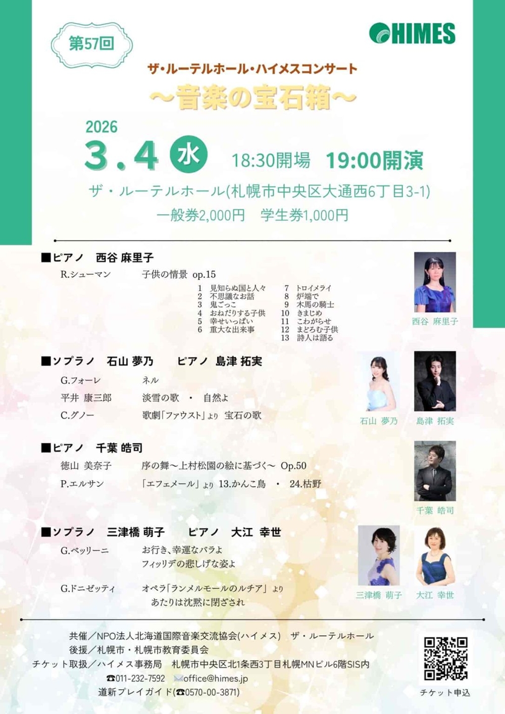第57回ザ・ルーテルホール・ハイメスコンサート〜音楽の宝石箱〜 3月4日(水)19:00〜20:30 ザ・ルーテルホール(札幌市中央区大通西6丁目3-1) 出演者・演奏曲 @ピアノ/西谷麻里子 R.シューマン/子供の情景 op.15 Aソプラノ/石山 夢乃、ピアノ/島津 拓実 G.フォーレ/ネル 平井康三郎/淡雪の歌・自然よ C.グノー/『ファウスト』より「宝石の歌」 Bピアノ/千葉 皓司 徳山美奈子/序の舞〜上村松園の絵に基づく〜作品50 P.エルサン/『エフェメール』より「13.かんこ鳥」「24.枯野」 Cソプラノ/三津橋萌子、ピアノ/大江 幸世 ベッリーニ/お行き、幸運なバラよ /フィッリデの悲しげな姿よ ドニゼッティ/オペラ『ランメルモールのルチア』より「あたりは沈黙に閉ざされ」 |