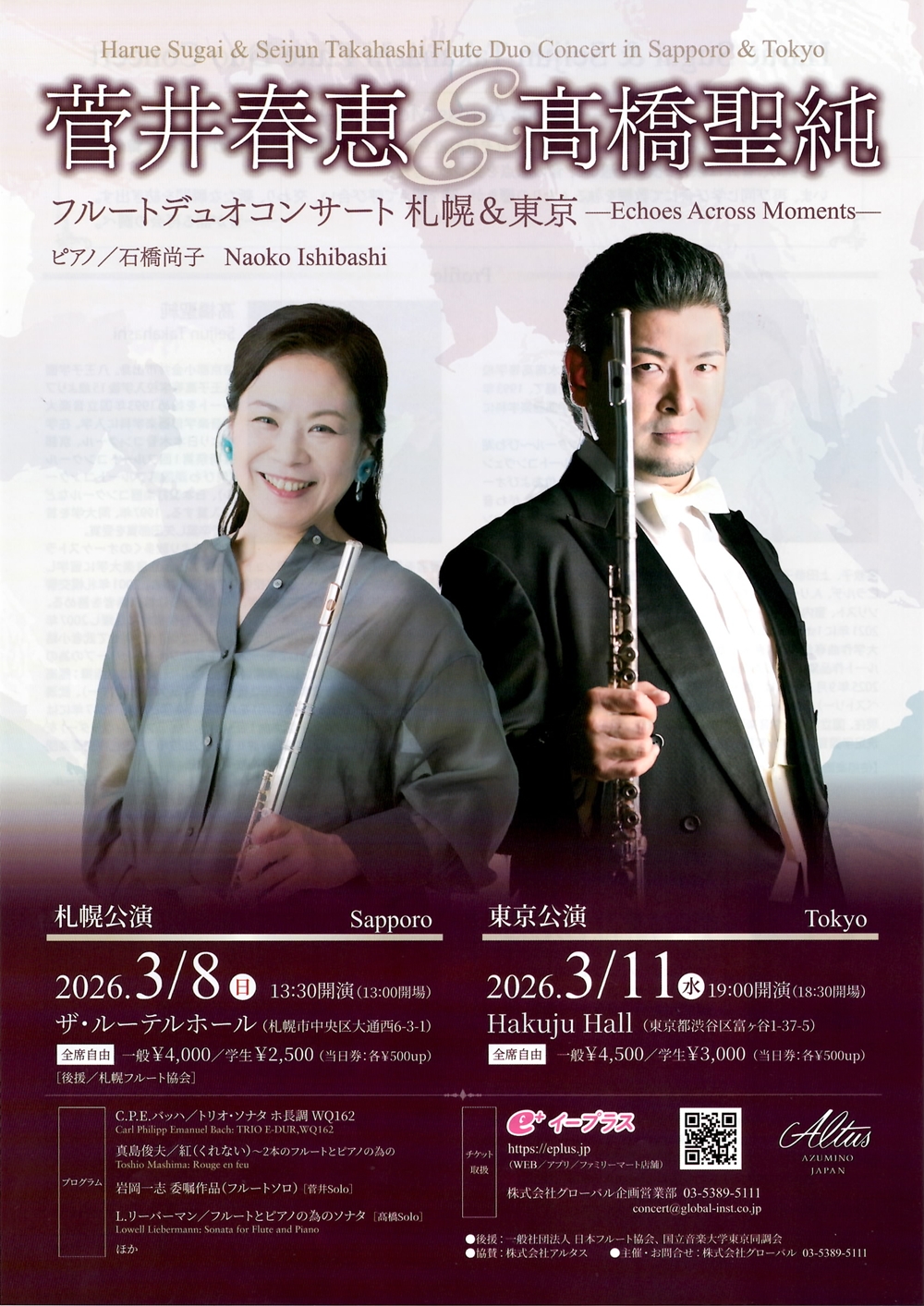 フルートデュオコンサート 札幌公演 3月8日(日)13:30 ザ・ルーテルホール(札幌市中央区大通西6丁目3-1) 出演 フルート/菅井 春恵 フルート/高橋 聖純 ピアノ/石橋 尚子 曲目 C.P.E.バッハ/トリオ・ソナタホ長調WQ162 間島俊夫/紅(くれない)〜2本のフルートとピアノのための 岩岡一志/委嘱作品(フルートソロ) L.リーバーマン/フルートピアノのためのソナタ ……ほか |