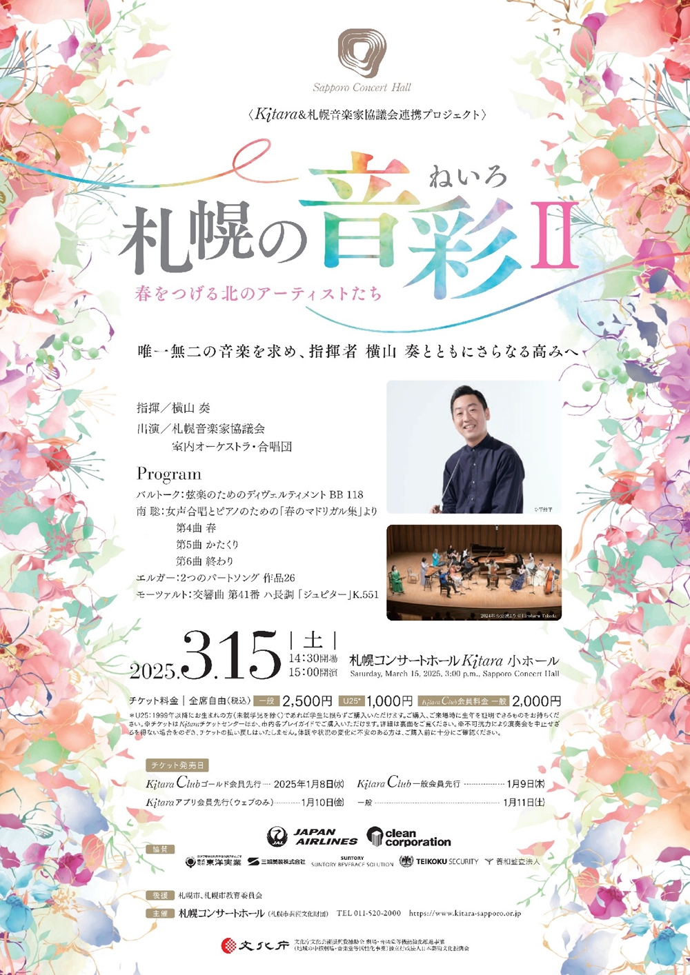 Kitara&札幌音楽家協議会連携プロジェクト札幌の音彩ねいろU 〜春をつげる北のアーティストたち〜 3月15日(土)15:00 札幌コンサートホールKitara小ホール 出演 指揮/横山 奏 出演/札幌音楽家協議会室内オーケストラ、合唱団 女声合唱 ソプラノ/太田 尚代、陣内麻由美、中田 友紀、藤田 典恵 メゾ・ソプラノ/伊藤真由美、越後小百合、大友ひろ世、小松 陽 アルト/斉藤みゆき、高田こず絵、一入まなみ、南 葉子 オーケストラ ピアノ/平野 雅子、三浦 京子 ヴァイオリン/長岡 聡季(コンサートマスター) 岩渕 晴子、垣原 遥愛、工藤 晶子、坂本 夕桂、鈴木 京、徳田 和可、山本 聖子、吉川美希子 ヴィオラ/今井 佑佳、岩田 貴子、後藤美和子、立木 一真 チェロ/中田 恵美、中島 杳子、山田 慶一 コントラバス/小笠原いづみ、鈴木 初、藤澤 光雄 フルート/吉田 玲子 オーボエ/水野麻衣子、脇坂真知子 ファゴット/石黒 玲、濱田 奈美 ホルン/佐藤 武紀、向畑華仁衣 トランペット/櫻井 求A古畑 亜紀 ティンパニ/中居 千里 副指揮者/陣内 直 プログラム バルトーク/弦楽のためのディヴェルティメントBB 118 南 聡/女声合唱とピアノのための『春のマドリガル集』より「第4曲 春」「第5曲 かたくり」「第6曲 終わり」 エルガー/2つのパートソング作品26「第1曲 雪」「第2曲 飛べ、泣く鳥よ」 モーツァルト/交響曲第41番ハ長調「ジュピター」K.551 |