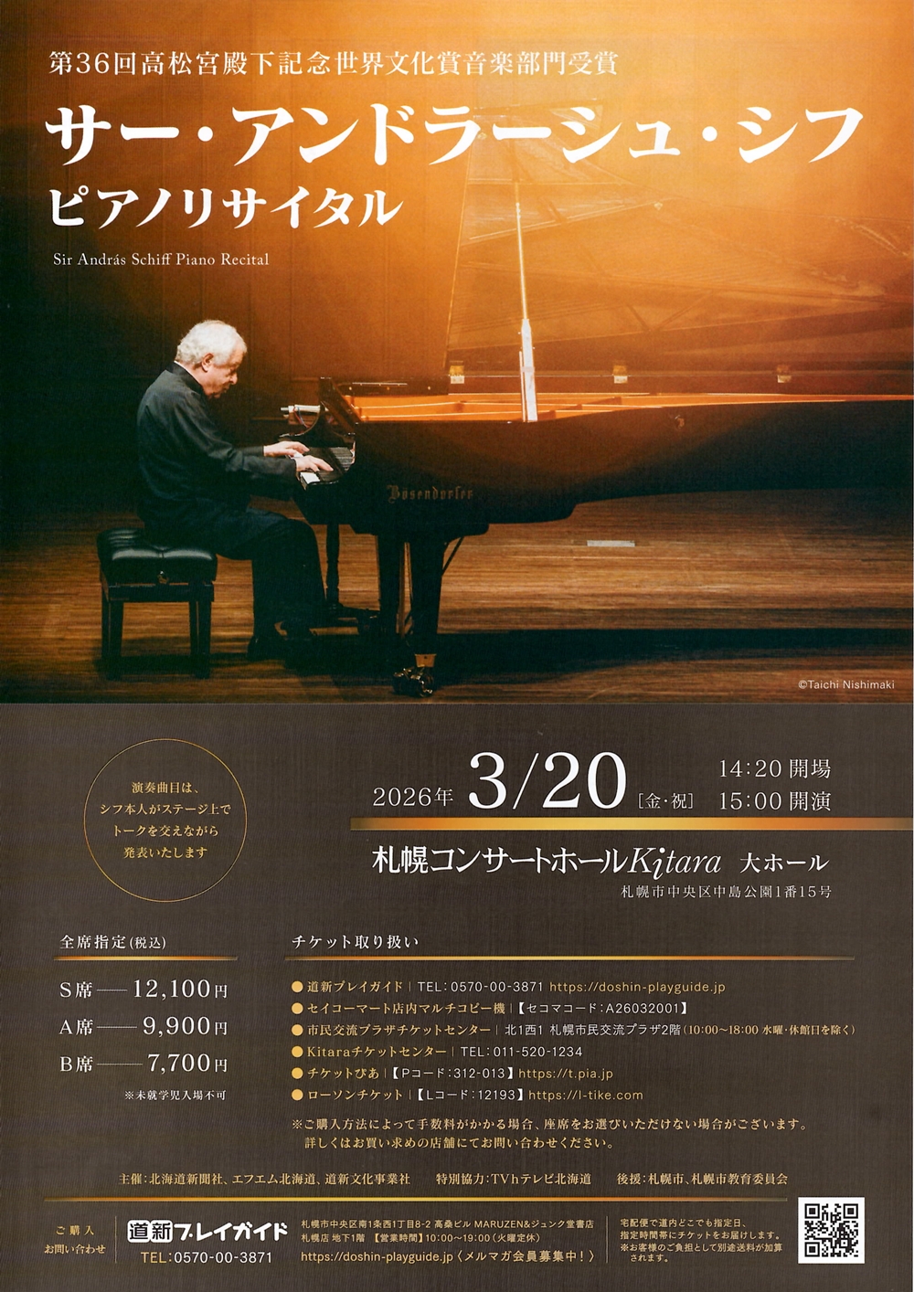 第36回高松宮殿下記念世界文化賞音楽部門受賞サー・アンドラーシュ・シフ ピアノリサイタル 3月20日(金・祝)15:00〜18:00 札幌コンサートホールKitara大ホール 出演 ピアノ/サー・アンドラーシュ・シフ 曲目 演奏曲目は、シフ本人がステージ上でトークを交えながら発表いたします。 |