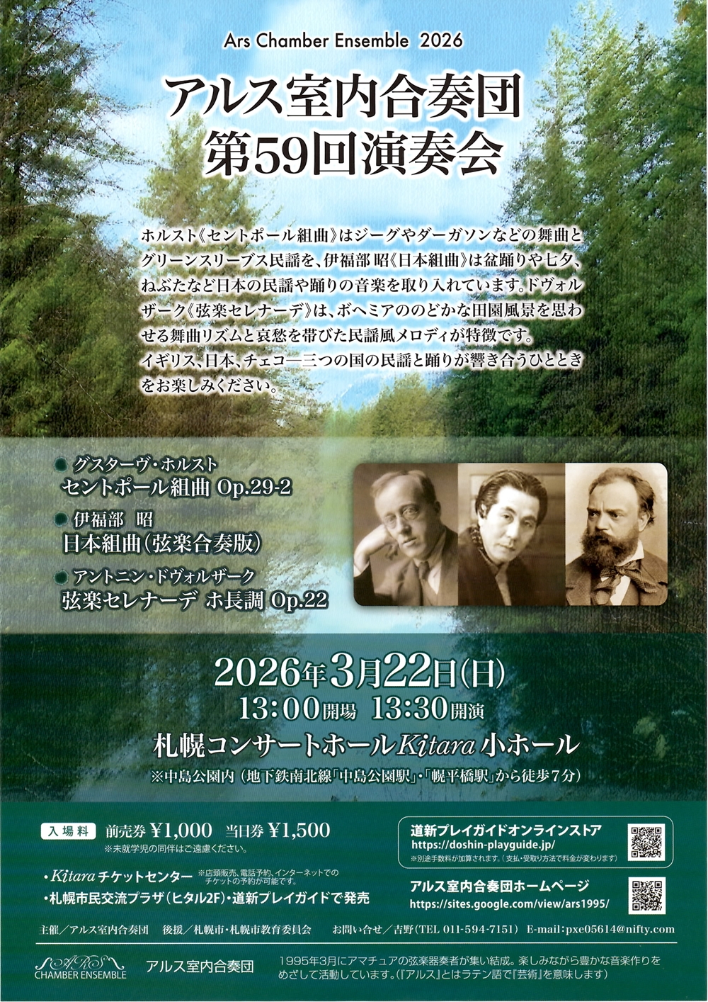アルス室内合奏団 第59回演奏会 3月22日(日)13:30 札幌コンサートホールKitara小ホール 出演 管弦楽/アルス室内合奏団 曲目 グスターヴ・ホルスト/セントポール組曲Op.29-2 伊福部昭/日本組曲(弦楽合奏版) アントニン・ドヴォルザーク/弦楽セレナーデホ長調Op.22 |