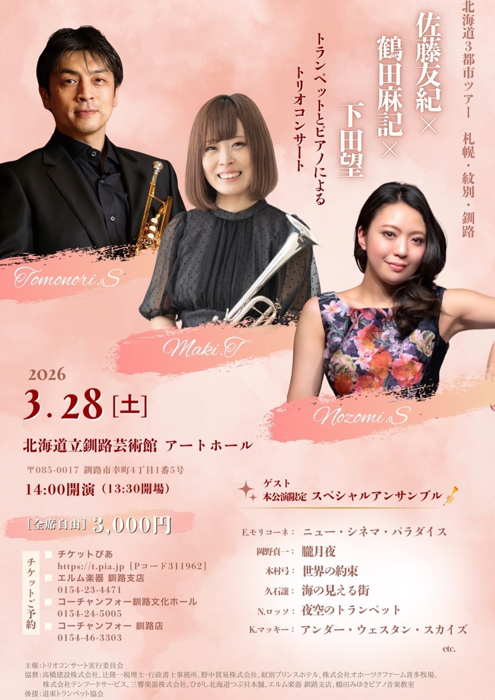 北海道3都市ツアー札幌・紋別・釧路佐藤友紀×鶴田麻紀×下田望 トランぺットとピアノによる トリオコンサート 3月28日(土)14:00 北海道立釧路芸術館アートホール(釧路市幸町4丁目1-5) 出演 トランペット/佐藤 友紀(東京藝術大学非常勤講師) トランペット/鶴田 麻記(タカティカートオーケストラトランペット首席奏者) ピアノ/下田 望(東京藝術大学音楽学部管打楽器科演奏研究員) 曲目 E.モリコーネ/ニュー・シネマ・パラダイス 岡野貞一/朧月夜 木村弓/世界の約束 久石譲/海の見える街 N.ロッソ/夜空のトランペット K.マッキー/アンダー・ウェスタン・スカイズ ……他 |