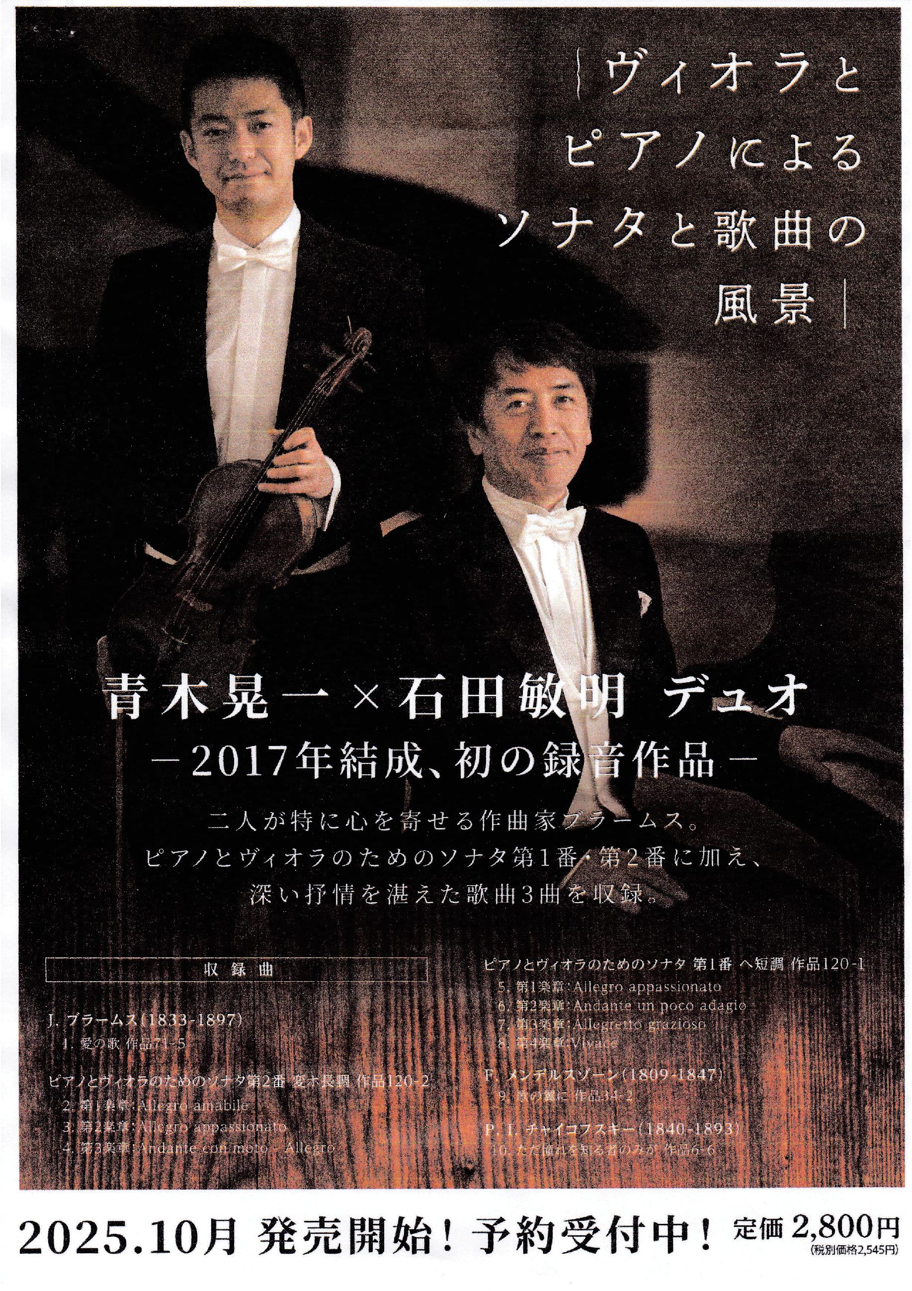 青木さんVaのCD発売のお知らせ (10/18) New! ヴィオラ奏者の青木さんとピアニストの石田さんが、ブラームスのソナタを録音しCDになり、10月から発売することになりました。CDは定期演奏会会場のピリッキーで購入することができます。 詳細は右の画僧ファイル(画像をクリックすると拡大画像をご覧いただけます。)をご覧ください。 収録曲 J.ブラームス(1833-1897) 1.愛の歌作品71-5 ピアノとヴィオラのためのソナタ第2番変ホ長調作品120-2 2.第1楽章:Allegro amabile 3.第2楽章:Allegro appassionato 4.第3楽章:Andsnte con moto-Allegro ピアノとヴィオラのためのソナタ第1番ヘ短調作品120-1 5.第1楽章:Allegro appassionato 6.第2楽章;Andante un poco adagio 7.第3楽章:Allegretto grazioso 8.第4楽章:Vivace F.メンデルスゾーン(1809-1847) 9.歌の翼に作品34-2 Ⅰ.チャイコフスキー(1840-1893) 10,ただ憧れを知る者のみが作品6-6 |