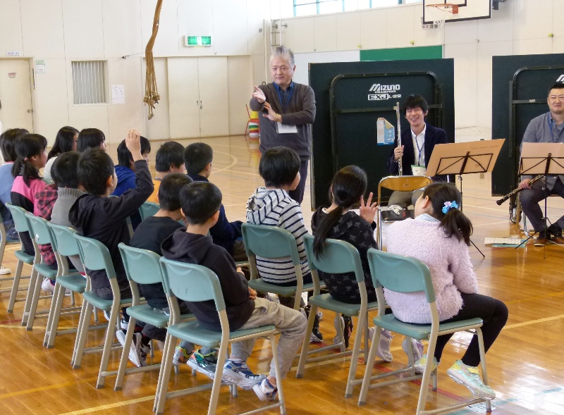 | 平成28年度文化芸術による子供 育成事業(巡回公演事業)事前訪問 オーケストラ演奏会で訪れる学校を事前に訪問し、楽器紹介や演奏家のお話しなど音楽家とのコミュニケーションを図ることを主体とした事前学習を行う 10月24日(月)〜27日(木) 奈良県橿原市立金橋小学校、平群町立平群小学校、香芝市立志都美小学校、大阪府枚方市立中宮小学校、大阪市立城東小学校、和歌山県広川町立南広小学校 出演 フルート(客演)/沼田 絵恋 オーボエ/宮城 完爾 クラリネット/多賀 登 ファゴット/村上 敦 ホルン/折笠 和樹 |